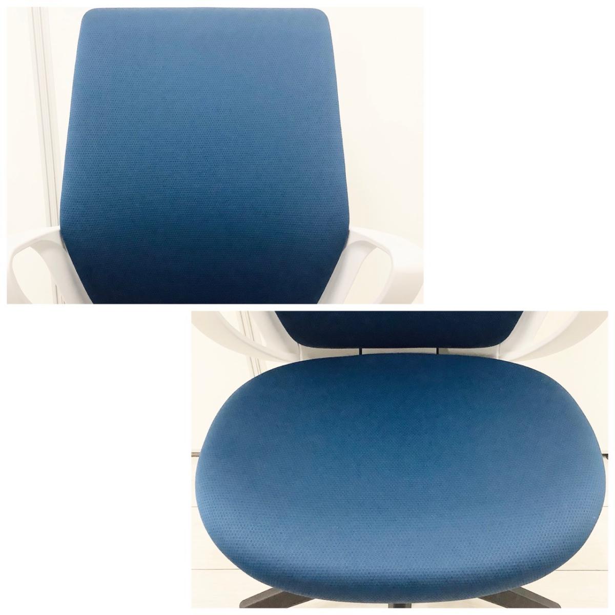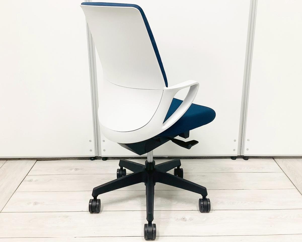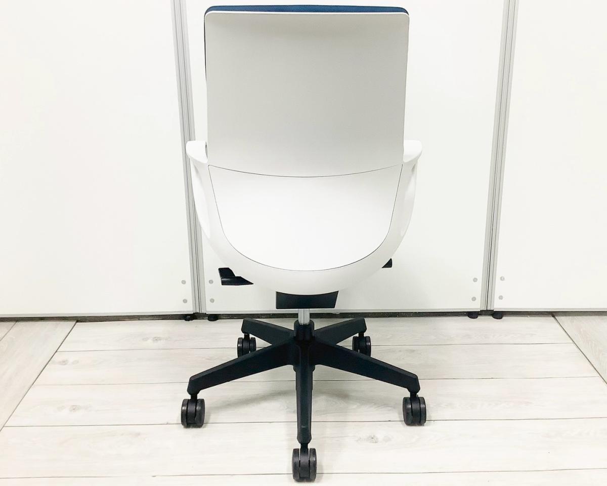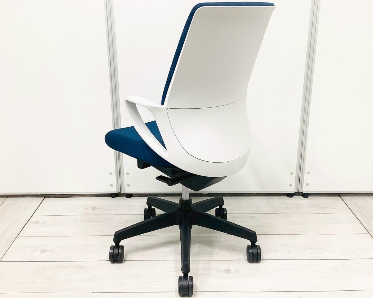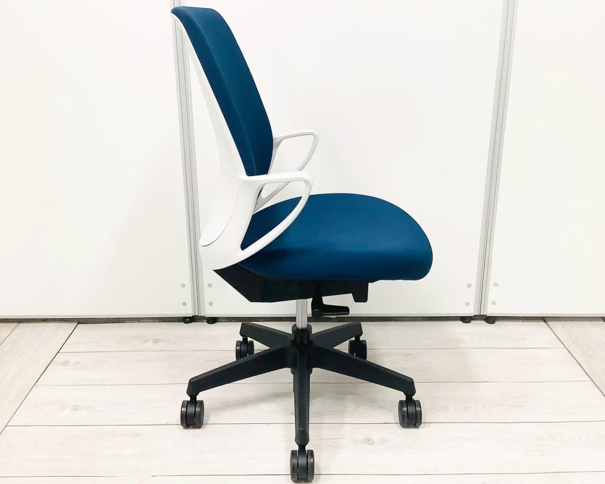 【デスクにスッキリ収納できるコンパクト設計!オフセットアームで必要最低限サイズでにデスクやテーブルに近づくことができ、収納時にも邪魔になりません!】■コクヨ(KOKUYO)製 ピコラチェア(picora) 肘付ハイバック ■固定肘 ■プルシアンブルー×ホワイトシェル×脚ブラック