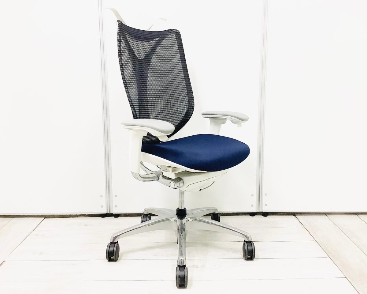 【前傾チルト付!流れるような美しいフォルムの最高級メッシュチェア!】■オカムラ(okamura)製 Sabrina(サブリナ) ハイバック 肘付き ■可動肘 ■背面メッシュ:アクアブルー 座面:ブルー ホワイトフレーム
