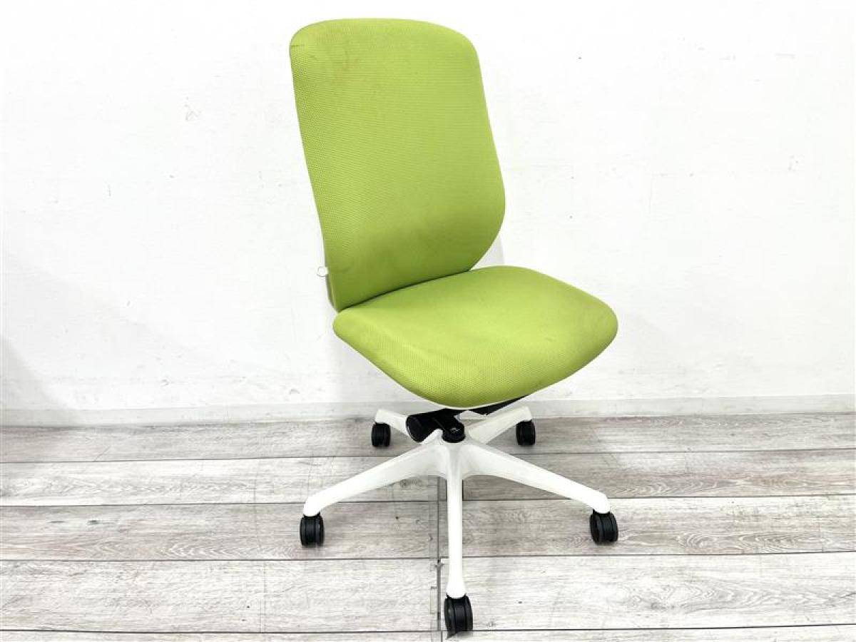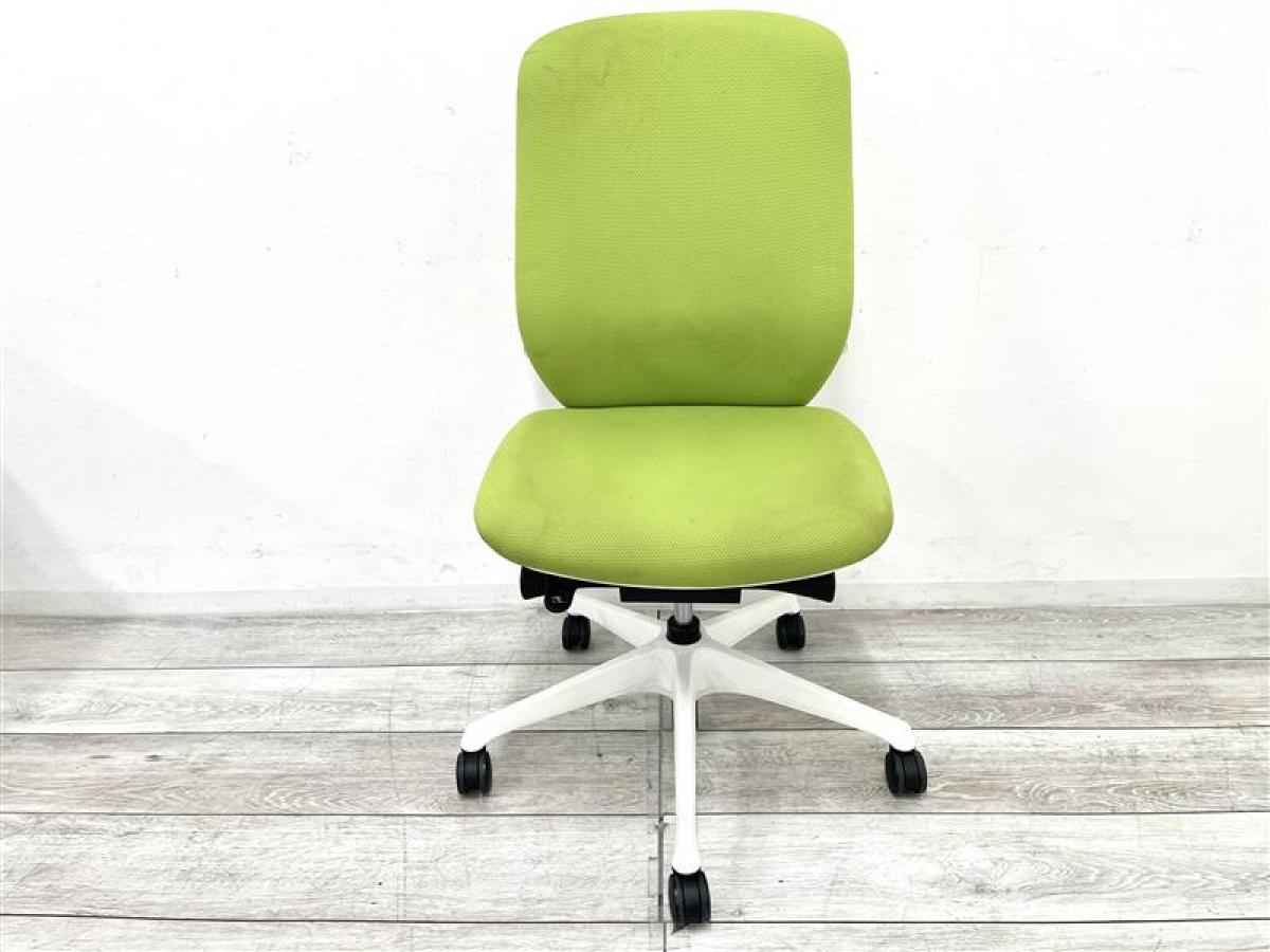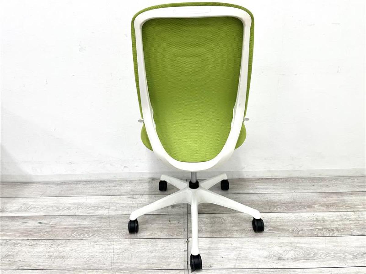 オカムラ製 シルフィーシリーズ ライムグリーン ホワイトフレーム 背面クッション コートハンガー付き 快適な座り心地を実現! 人気シリーズの背面クッションモデル! 肘無しハイバックチェア!!