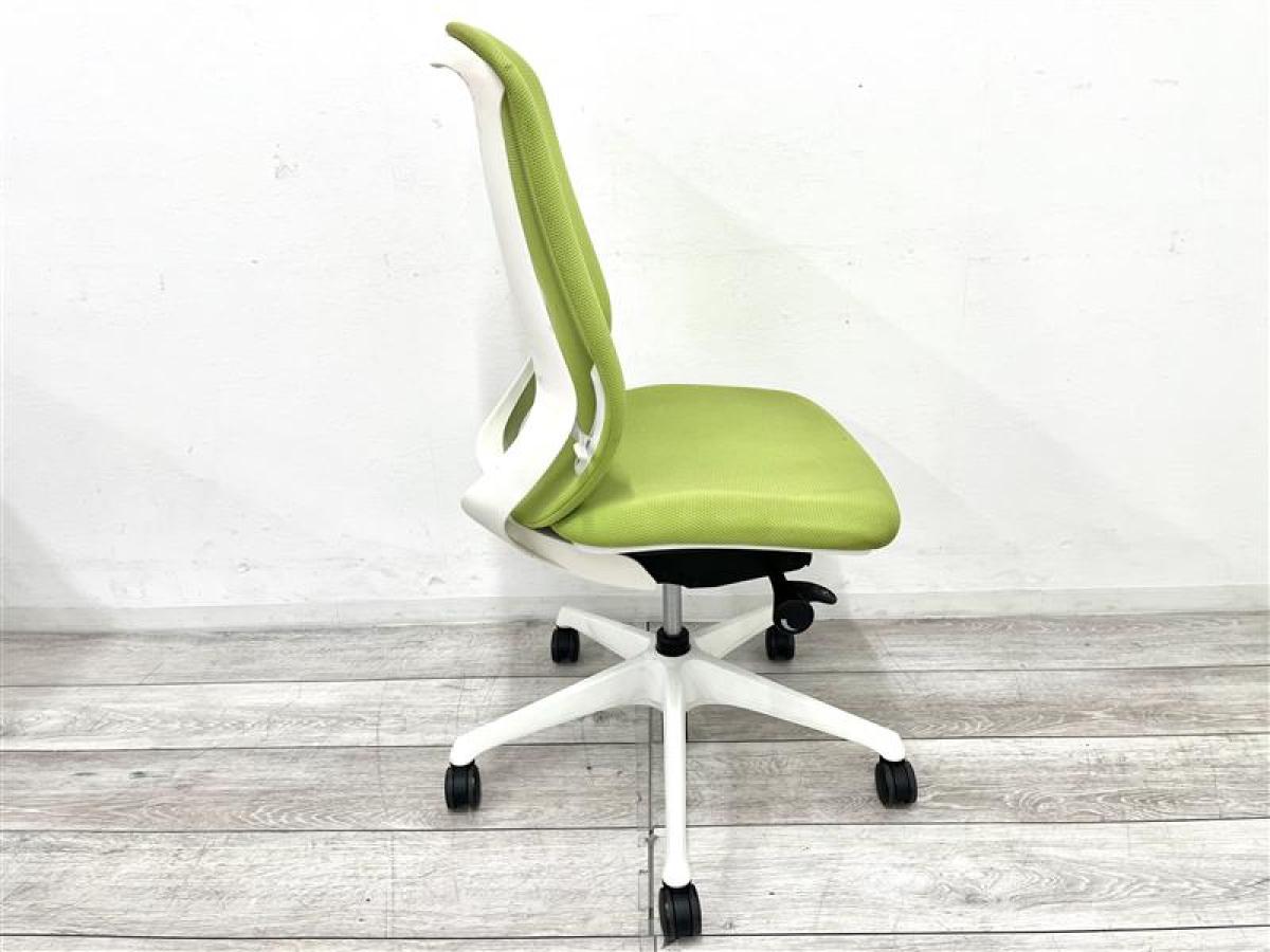 オカムラ製 シルフィーシリーズ ライムグリーン ホワイトフレーム 背面クッション コートハンガー付き 快適な座り心地を実現! 人気シリーズの背面クッションモデル! 肘無しハイバックチェア!!