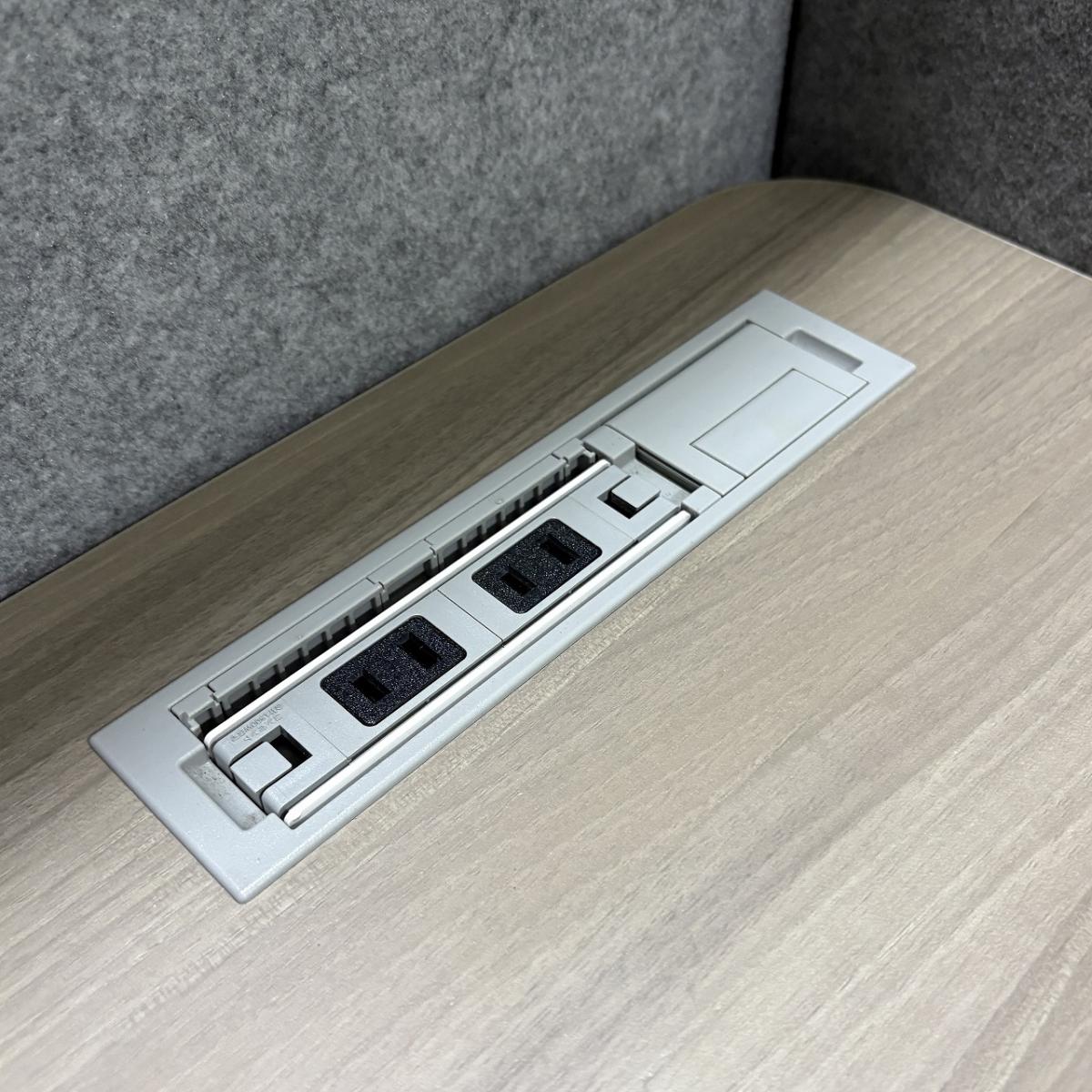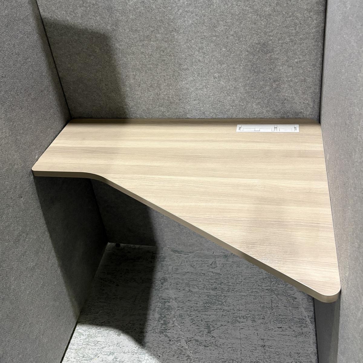 視線がブースの角に向かい、周囲の人の動きが視界に入りにくくなるようにデザインされたワーク天板。