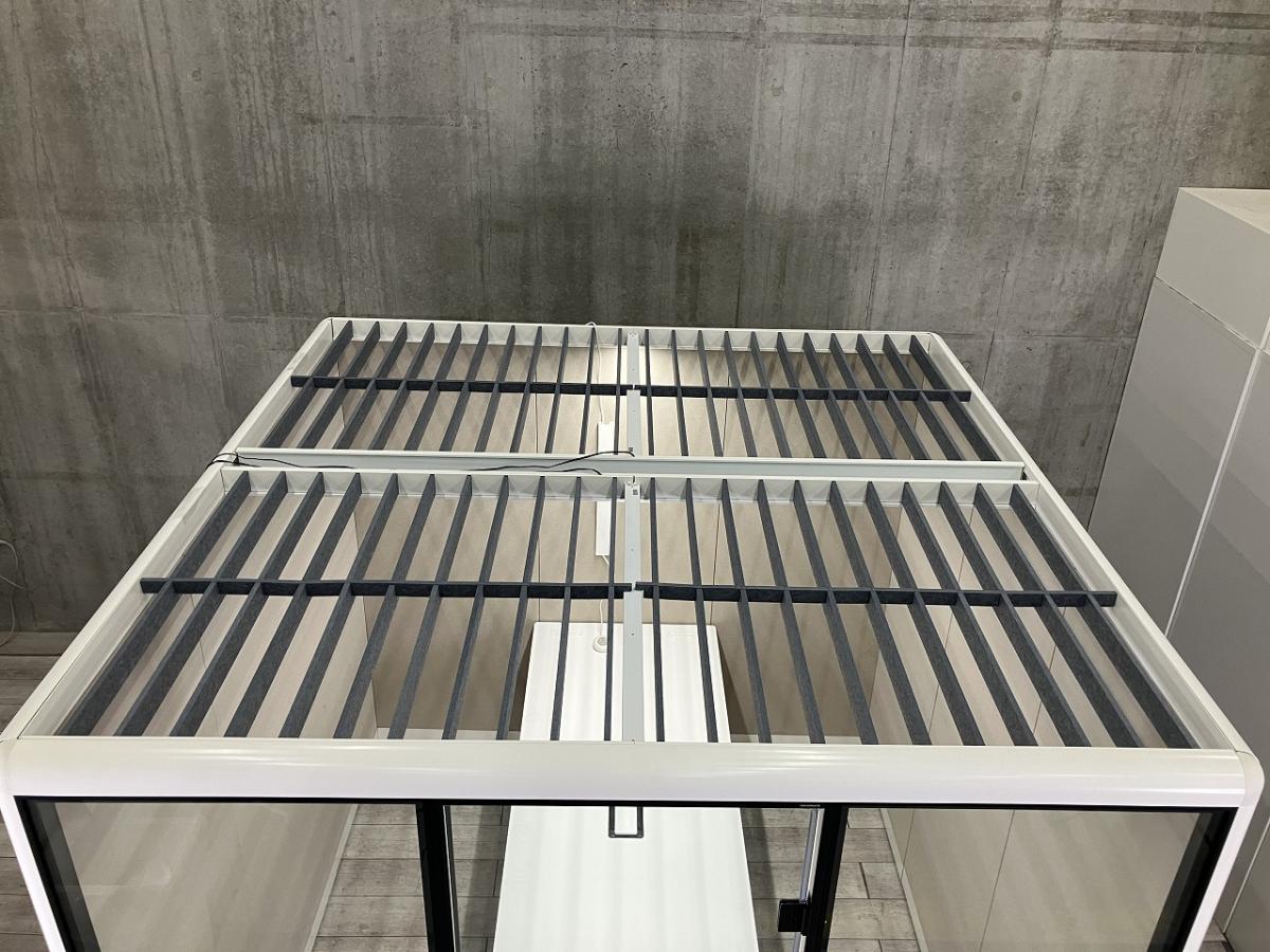 【4~6名様使用のセミクローズワークブース!スタイリッシュなガラス扉!】■オカムラ(okamura) スノーハット (Snow Hut) グループ(Group)多人数用 Bタイプ ■W2400×D2400×H2100㎜ ■テーブル・ライト付き ※ソファなし ■色:フレーム/ ホワイト パネル/ グレー【ABW商材】【関東倉庫在庫品】【弊社使用欄:A01011487】- 全店共通商品