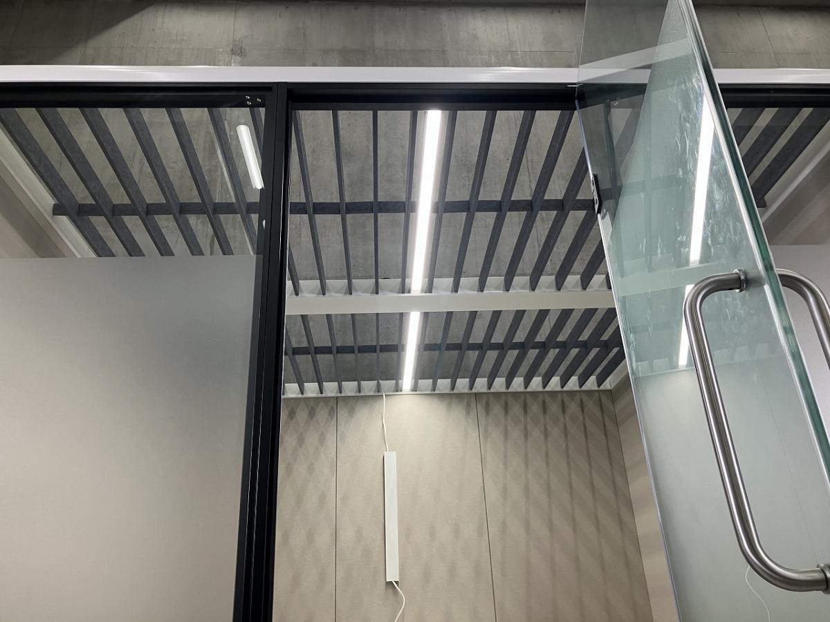 天井はルーバータイプで天井照明は埋め込み型となっております。