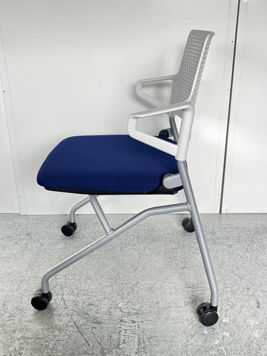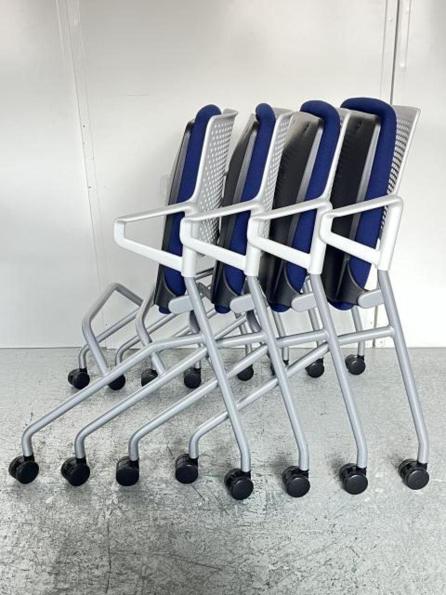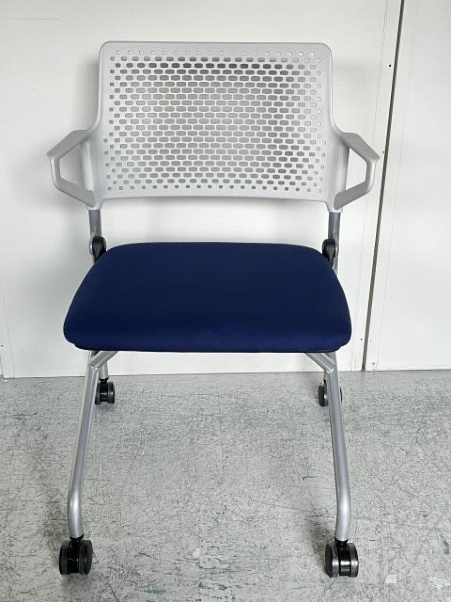 【折り畳んで収納!キャスター付で動作も楽々!】■ウチダ(UCHIDA)製 FM-345シリーズ 肘付 ネスティングチェア 会議用 キャスター付 ■背面樹脂メッシュ ■ブルー×ホワイトシェル