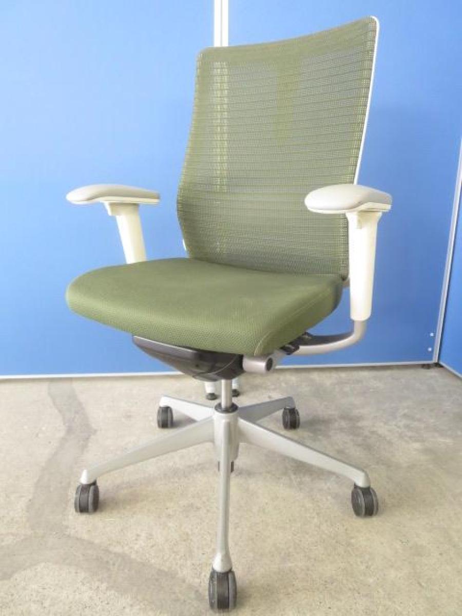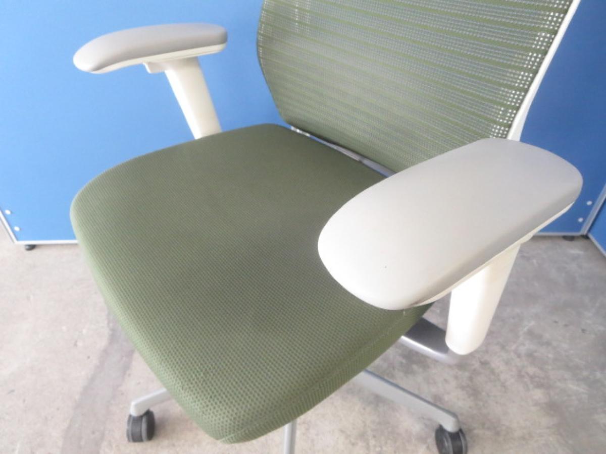 ★【T10】【商品入替のため、残り1脚限り】オカムラ製 コーラル(Choral) ライムグリーン ホワイトシェル ハイバック 肘付き メッシュ背面 アジャストアーム※可動肘 ハンガー付 どんな空間にも調和するデザインと最上級の操作性! 肘付きハイバックチェア!!【管理番号:A01024742】