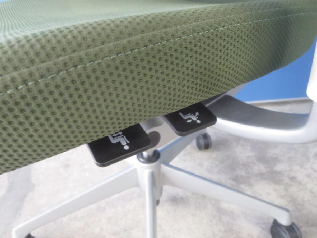 座面の高さ調整、座面のスライド調整の操作を、すべて座面の裏側に集約。