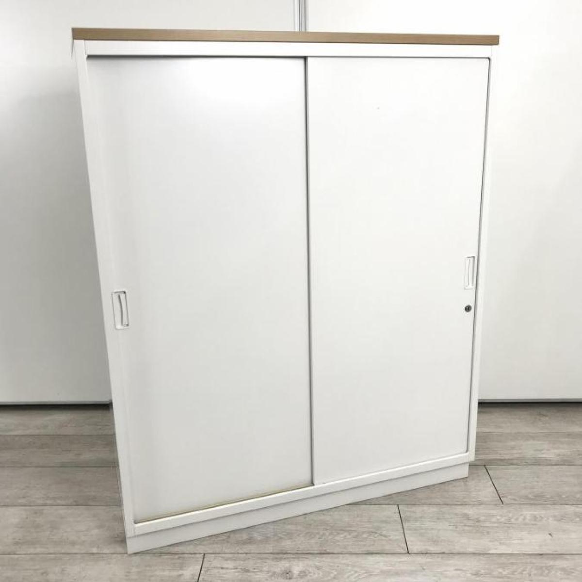 【スライド式なので開閉スペースに困りません!人気の3枚引き戸書庫!】■イトーキ (ITOKI)製 シンラインシリーズ 引き違い書庫 ローキャビネット 3枚引き戸 H1120㎜ ■天板付 ■ホワイト ■シリンダー錠