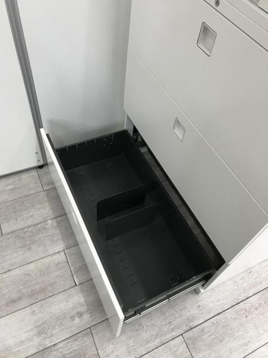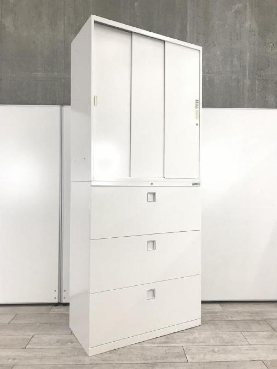 スライド式の扉+引き出しタイプの便利な書庫セットが入荷!使い勝手抜群のハイキャビネットが入荷! ■オカムラ/レクトライン/ホワイト 2枚引き戸+3段ラテラルキャビネット