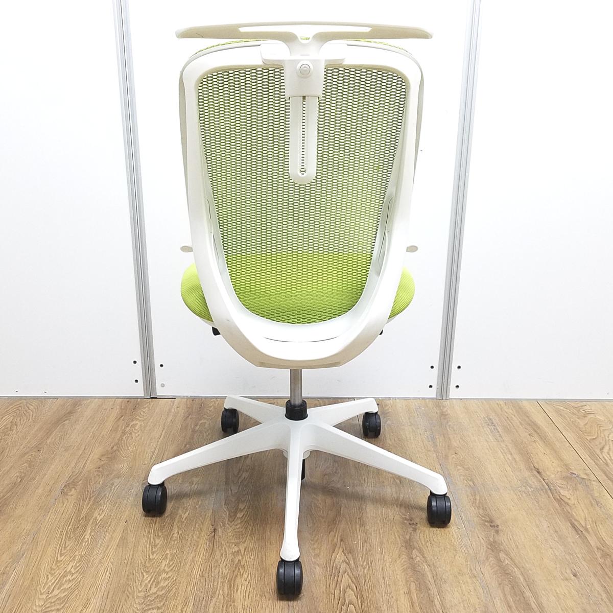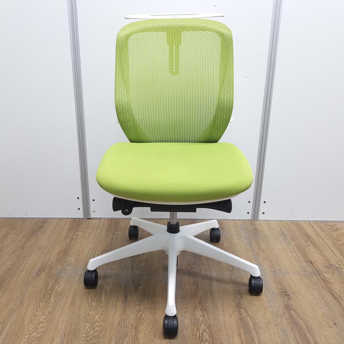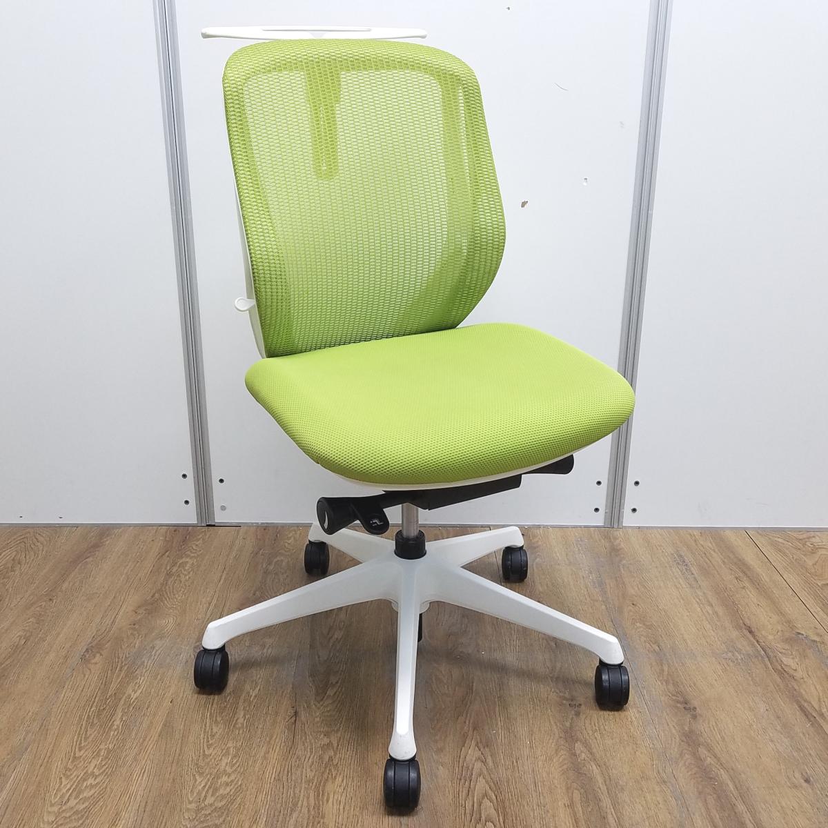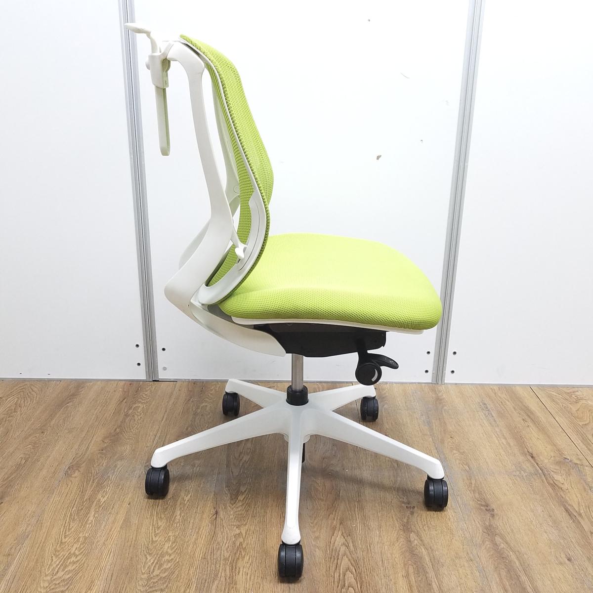 オカムラ製 シルフィシリーズ ライムグリーン ホワイトフレーム コートハンガー付き ローバック 肘無し 背面メッシュ 前傾チルト 自宅用 三次元曲面が快適にフィット! 機能付の大人気メッシュチェア! 肘無しローバックチェア!!- 京都東寺店