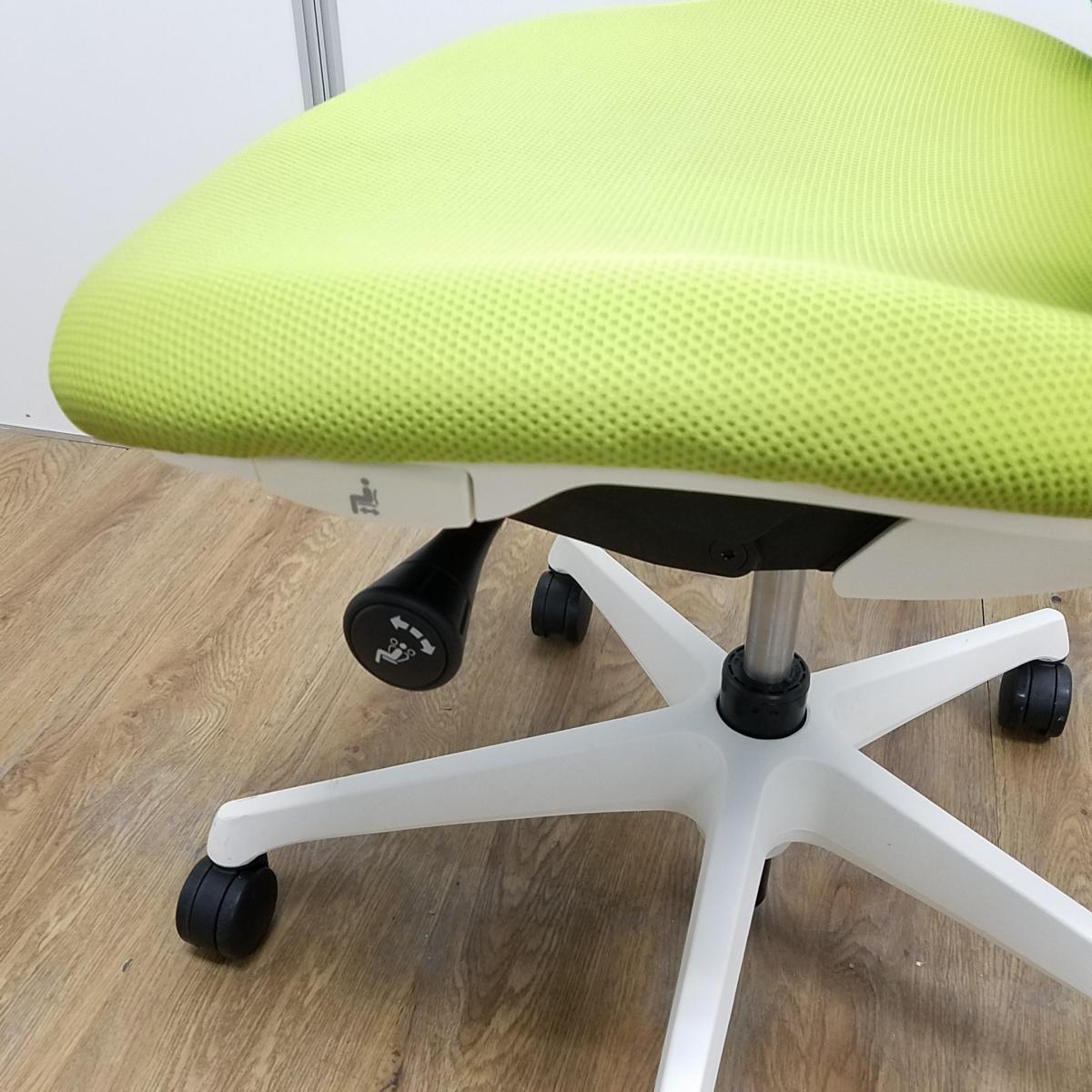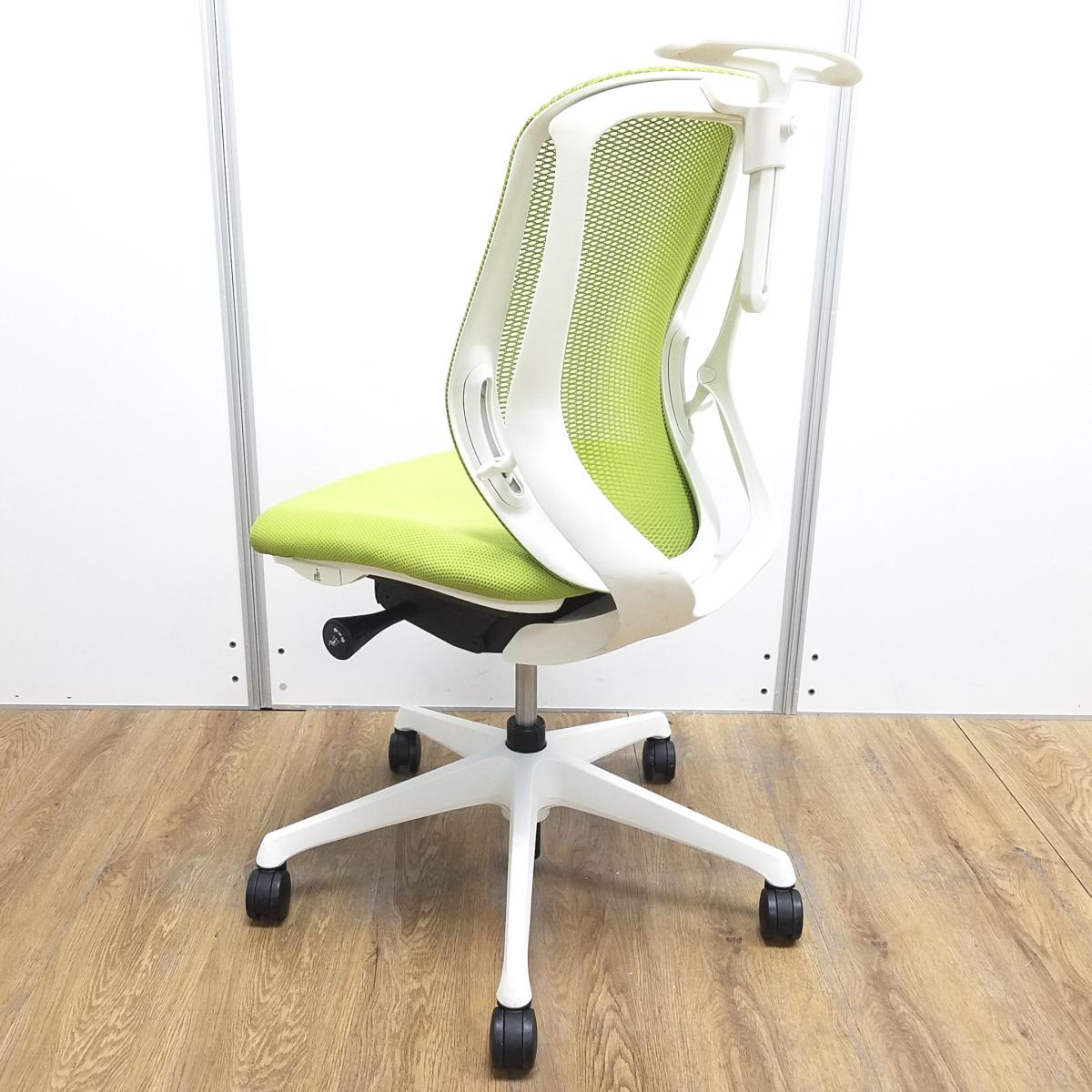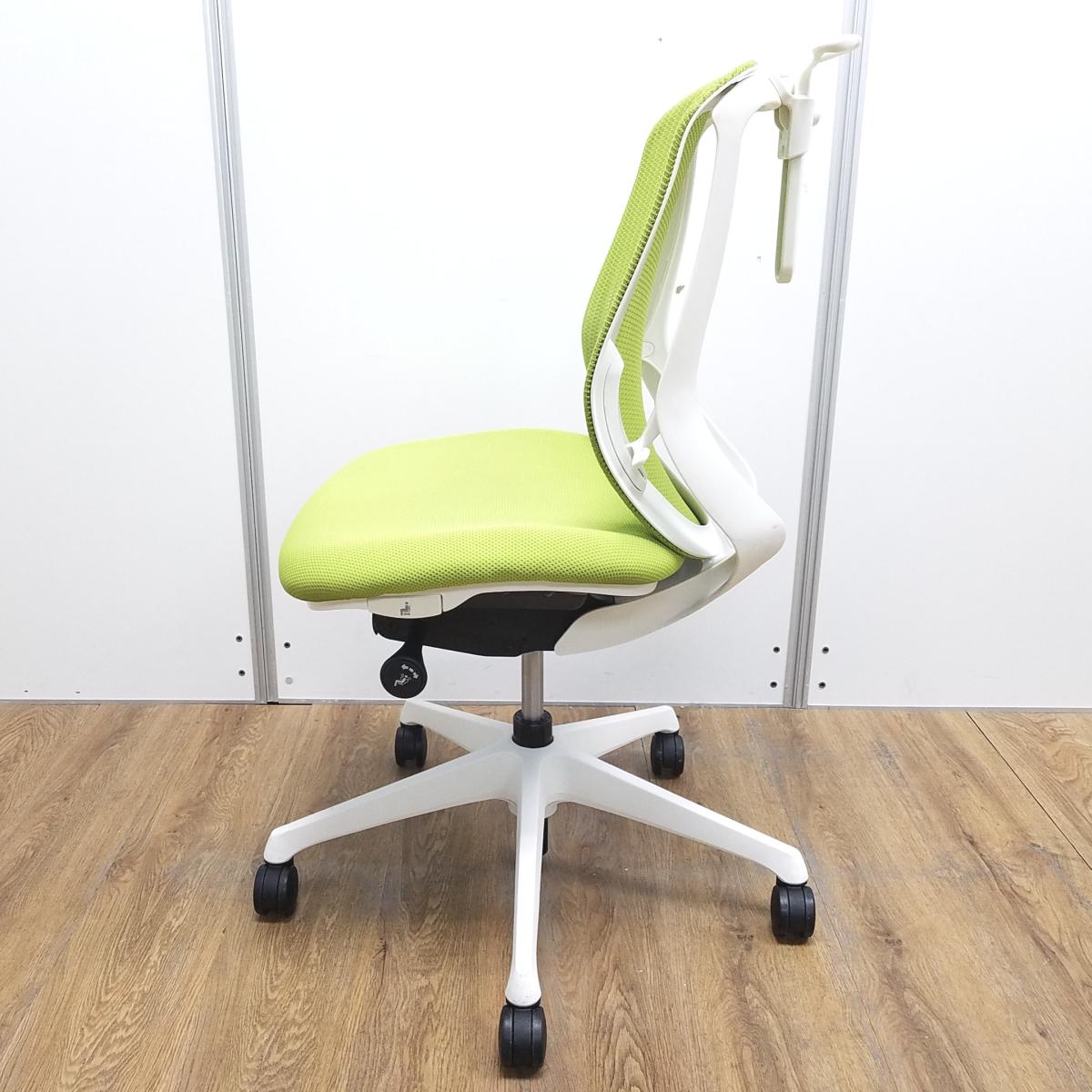 オカムラ製 シルフィシリーズ ライムグリーン ホワイトフレーム コートハンガー付き ローバック 肘無し 背面メッシュ 前傾チルト 自宅用 三次元曲面が快適にフィット! 機能付の大人気メッシュチェア! 肘無しローバックチェア!!- 京都東寺店