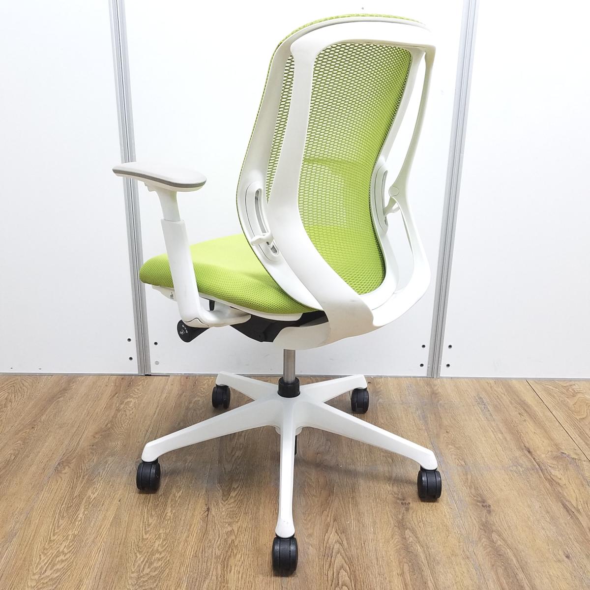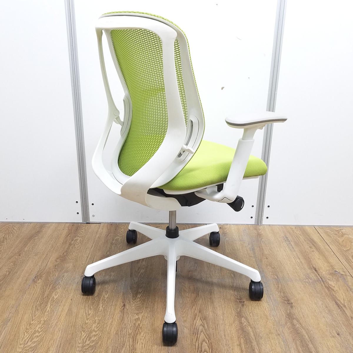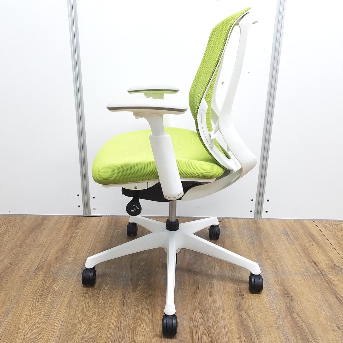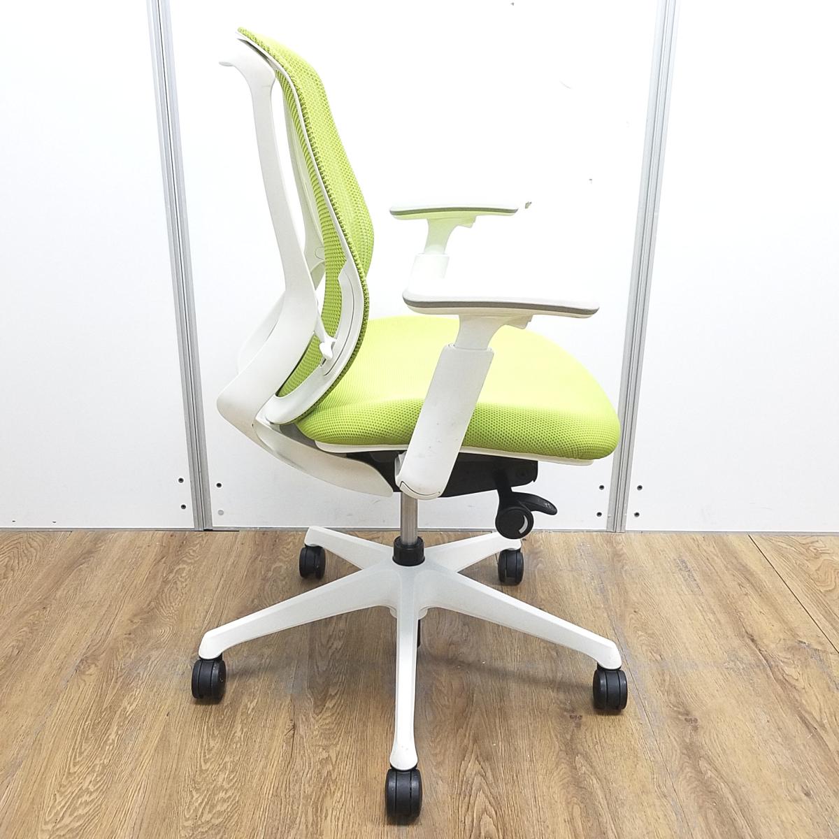 【T9】【商品入替のため、残り2脚限り】オカムラ製 シルフィシリーズ ライムグリーン ホワイトフレーム アジャストアーム※可動肘 ローバック 背面メッシュ 前傾チルト 自宅用 三次元曲面が快適にフィット! 機能付の大人気メッシュチェア! 肘付きローバックチェア!!サーキュラーバリューCO2削減量の算出について