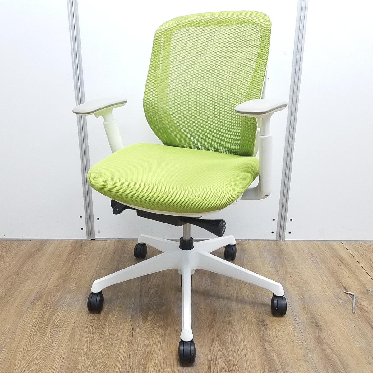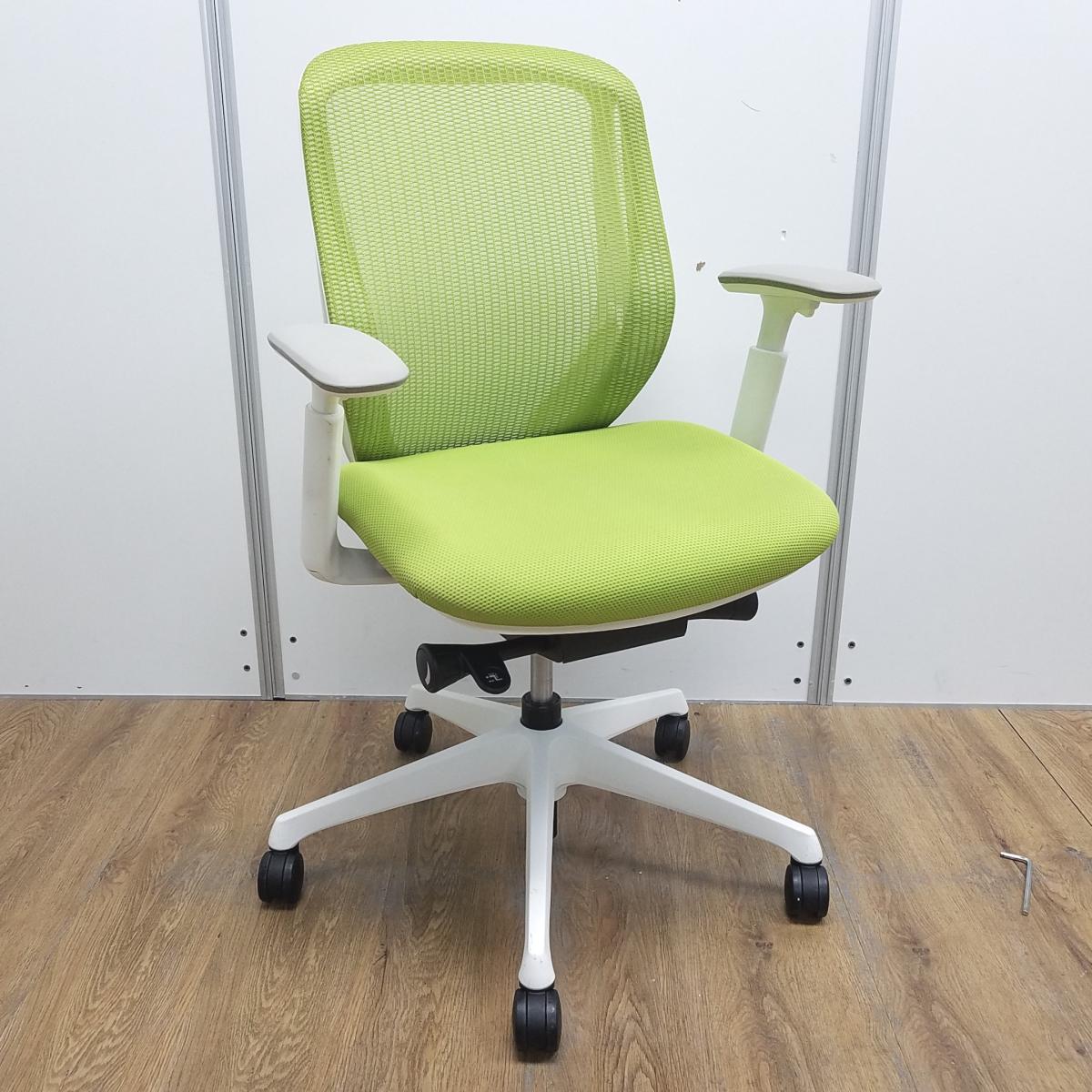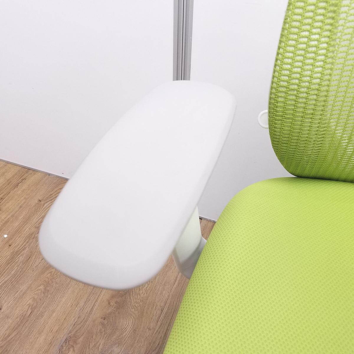 【T9】【商品入替のため、残り2脚限り】オカムラ製 シルフィシリーズ ライムグリーン ホワイトフレーム アジャストアーム※可動肘 ローバック 背面メッシュ 前傾チルト 自宅用 三次元曲面が快適にフィット! 機能付の大人気メッシュチェア! 肘付きローバックチェア!!サーキュラーバリューCO2削減量の算出について