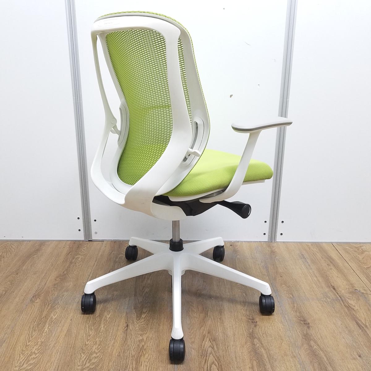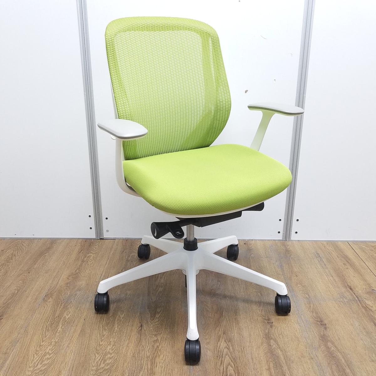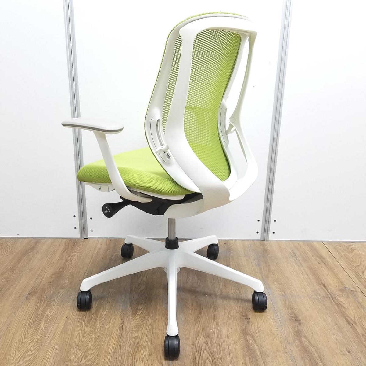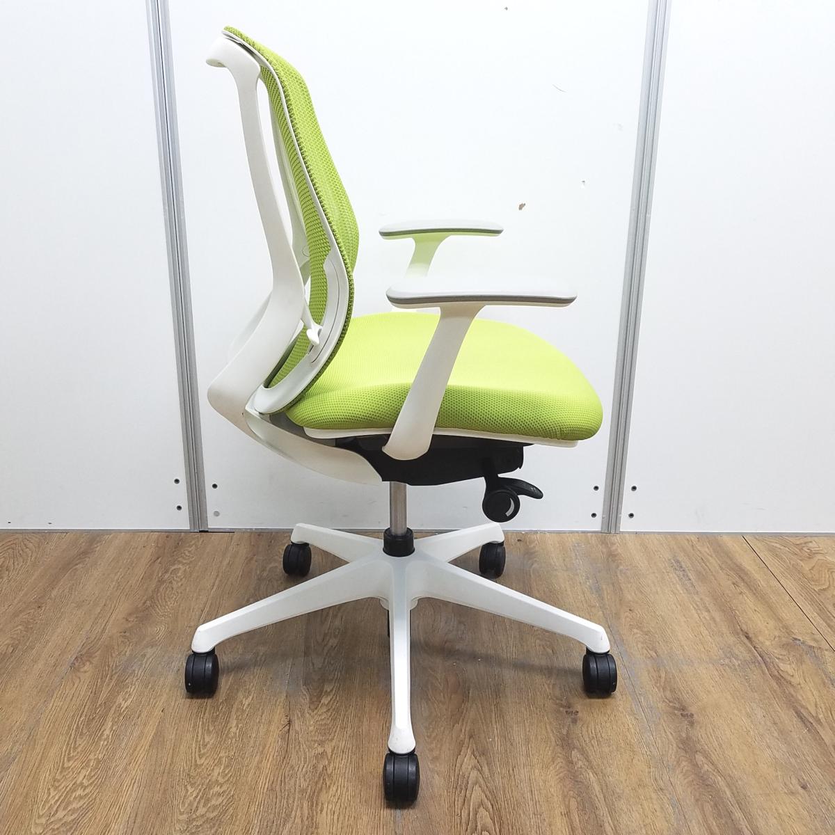 【商品入替のため、残り1脚限り】オカムラ製 シルフィシリーズ ライムグリーン ホワイトフレーム デザインアーム※固定肘 コートハンガー付き ローバック 背面メッシュ 前傾チルト 自宅用 三次元曲面が快適にフィット! 機能付の大人気メッシュチェア! 肘付きローバックチェア!!サーキュラーバリューCO2削減量の算出について