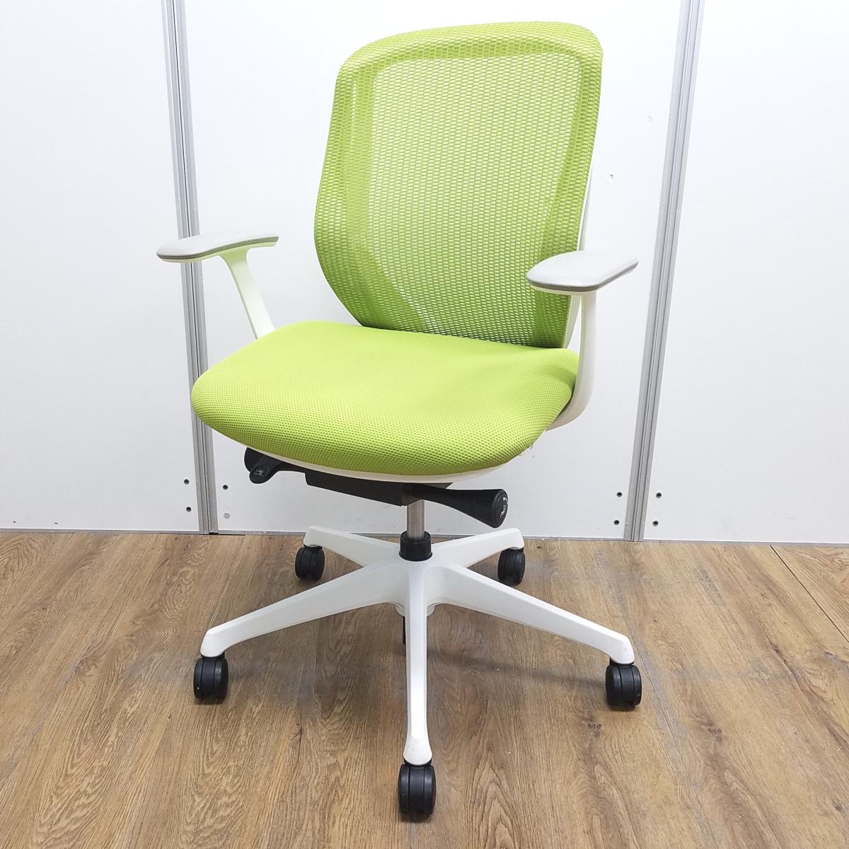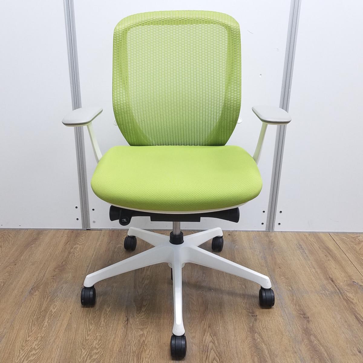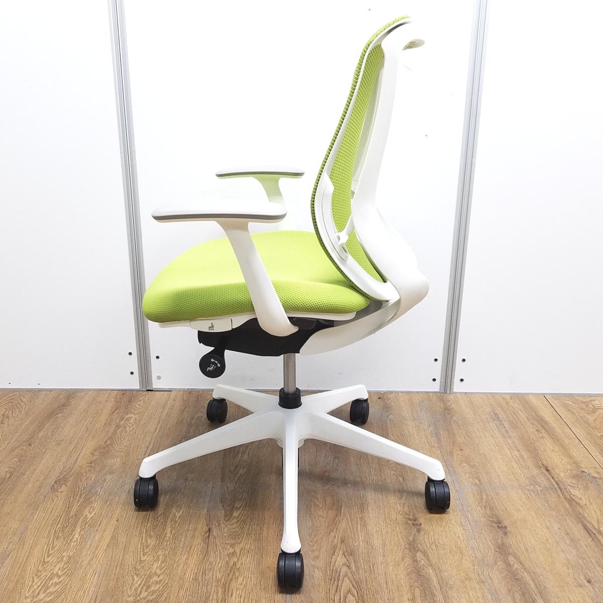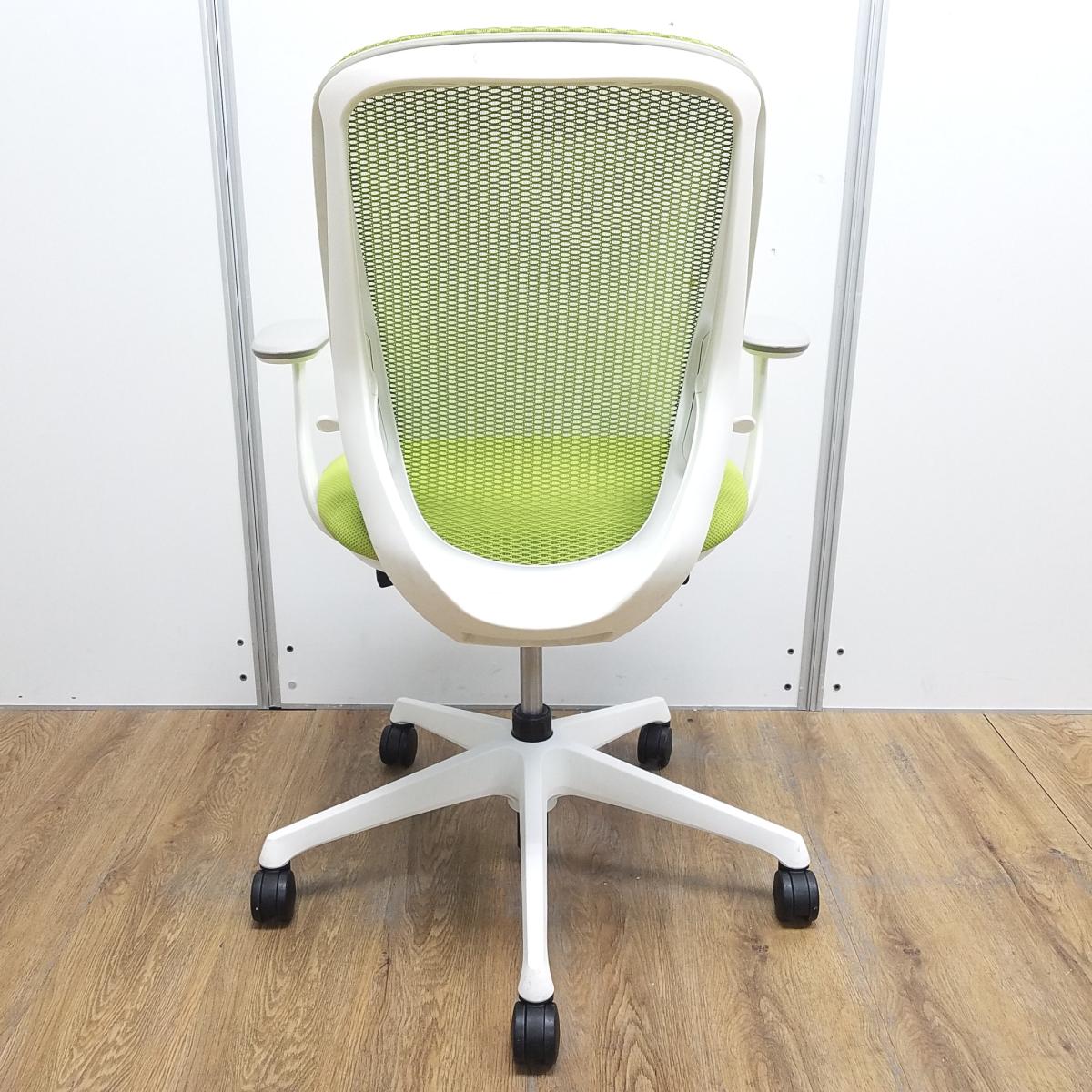【商品入替のため、残り1脚限り】オカムラ製 シルフィシリーズ ライムグリーン ホワイトフレーム デザインアーム※固定肘 コートハンガー付き ローバック 背面メッシュ 前傾チルト 自宅用 三次元曲面が快適にフィット! 機能付の大人気メッシュチェア! 肘付きローバックチェア!!サーキュラーバリューCO2削減量の算出について