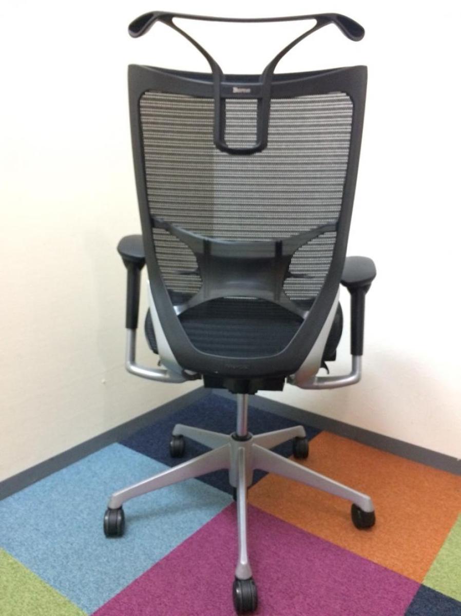 【2018年製】オカムラ バロンチェア エクストラハイバックモデル 座:メッシュ 背:メッシュ シルバーフレーム アジャストアーム 可動ヘッドレスト搭載 ※座面ヨレあり