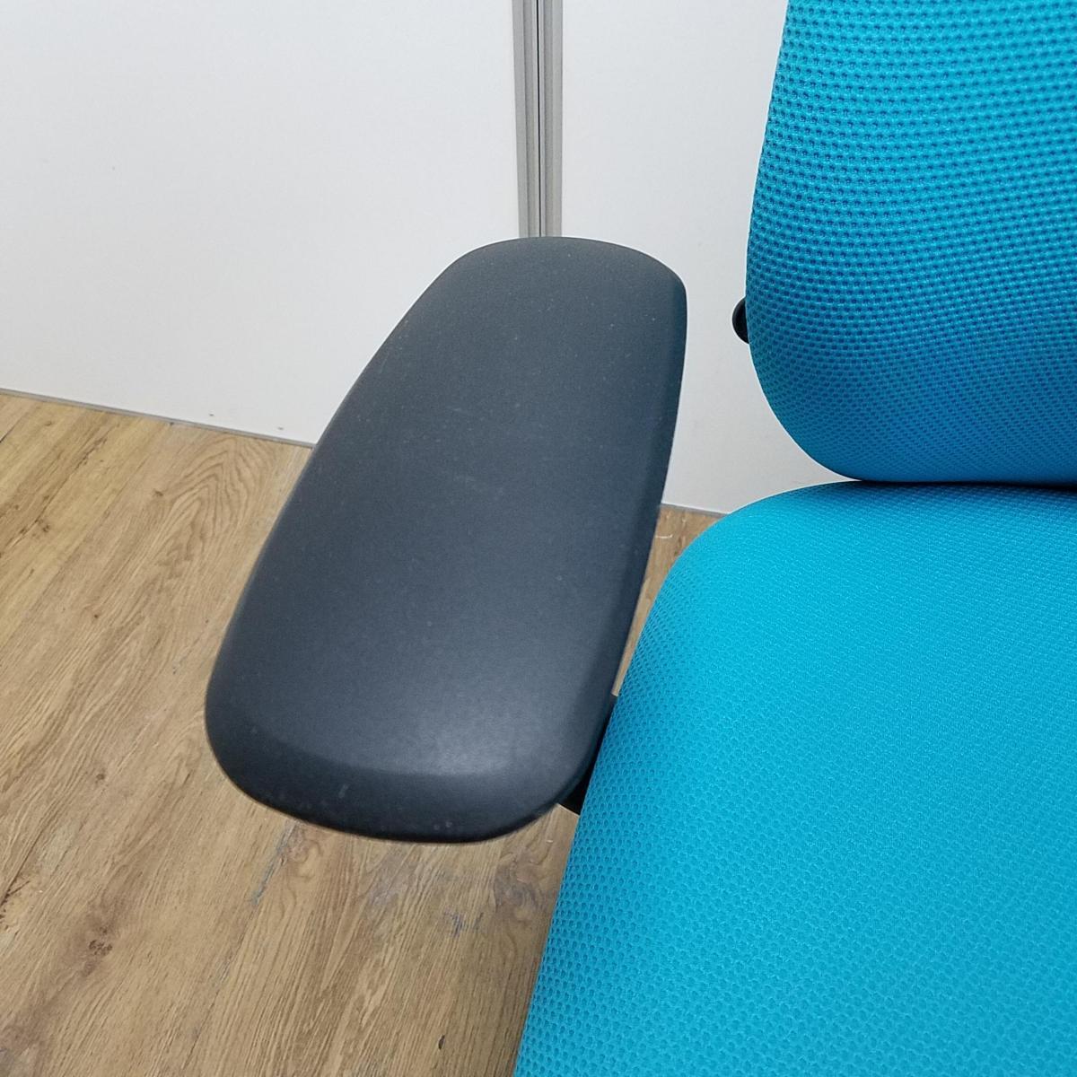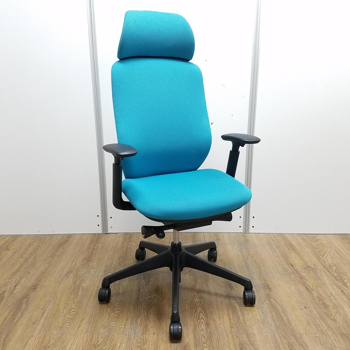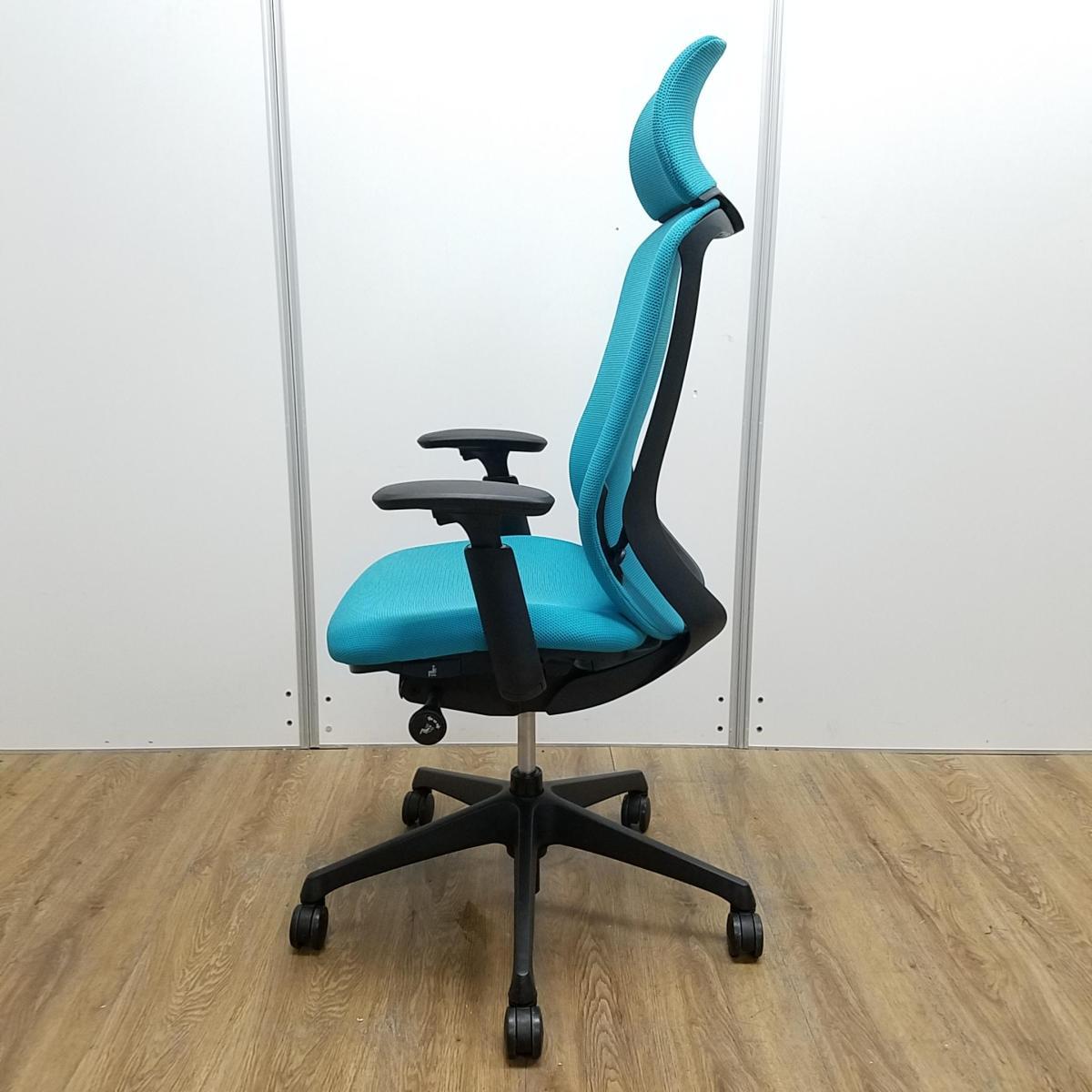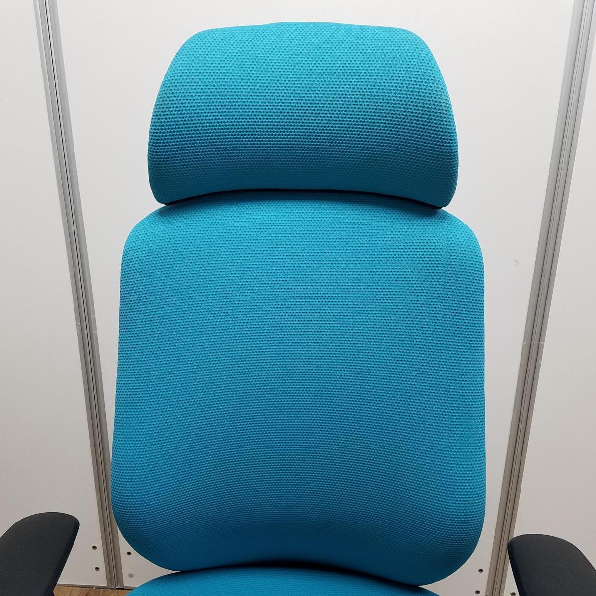 【T8】【商品入替のため、残り2脚限り】オカムラ製 シルフィーシリーズ ブルーグリーン ヘッドレスト アジャスタブル※可動肘 樹脂脚 肘付きハイバックチチェア!!- 京都東寺店