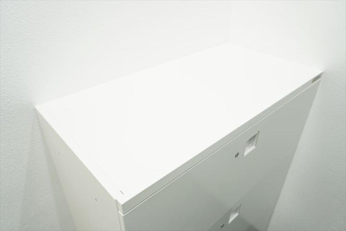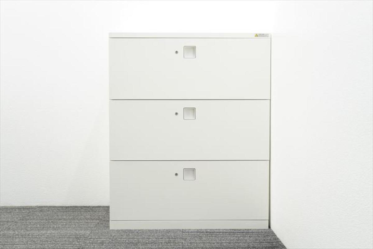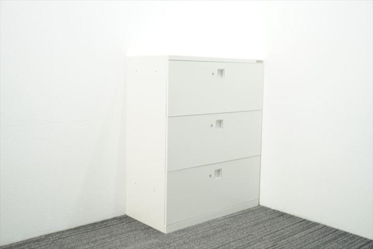 オカムラ レクトライン 3段ラテラル書庫 ホワイト天板 シリンダー錠 鍵付き ※取っ手部分に若干日焼けあり