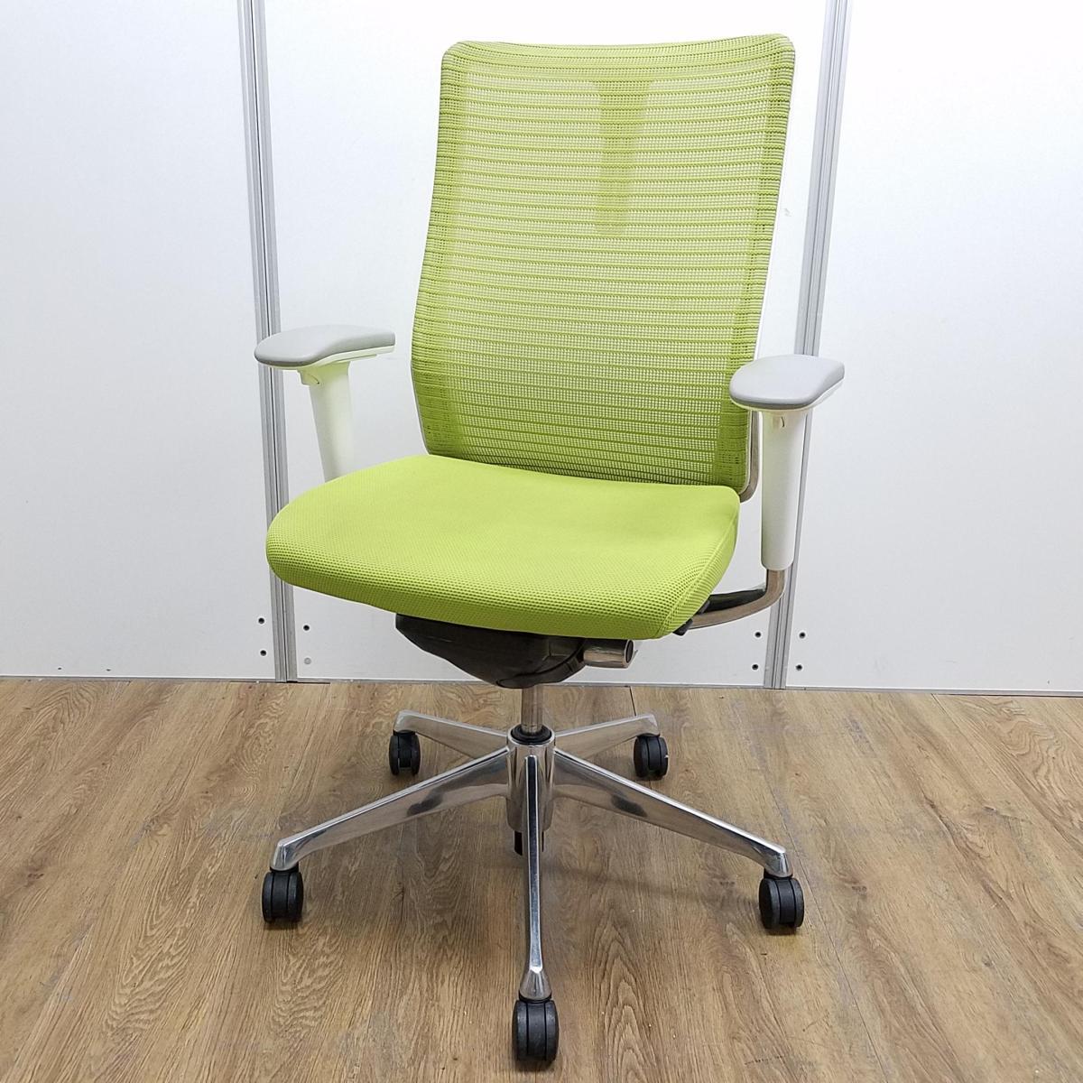 ★【T10】【商品入替のため、残り1脚限り】オカムラ製 コーラル(Choral) ライムグリーン ホワイトシェル ハイバック 肘付き メッシュ背面 アジャストアーム※可動肘 ハンガー付 どんな空間にも調和するデザインと最上級の操作性! 肘付きハイバックチェア!!【管理番号:A01024742】