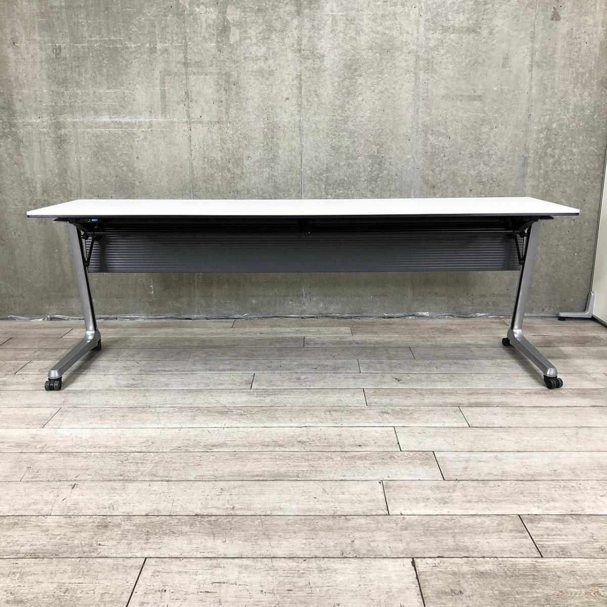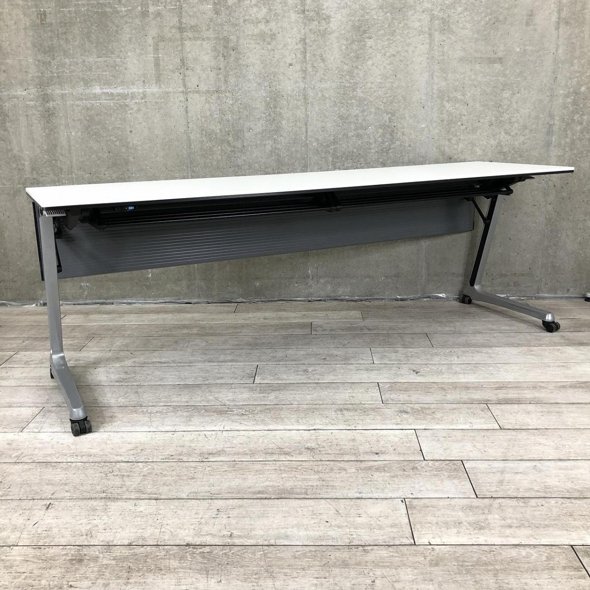 【折りたたみ収納が秀逸!スタイリッシュなデザイン!】■オカムラ(okamura)製 インターアクトPRO サイドスタックテーブル 3名用 幅2100mm ■幕板パネル付 ■ホワイト【大会議に使いやすい!】【K9】- 大阪・堺店