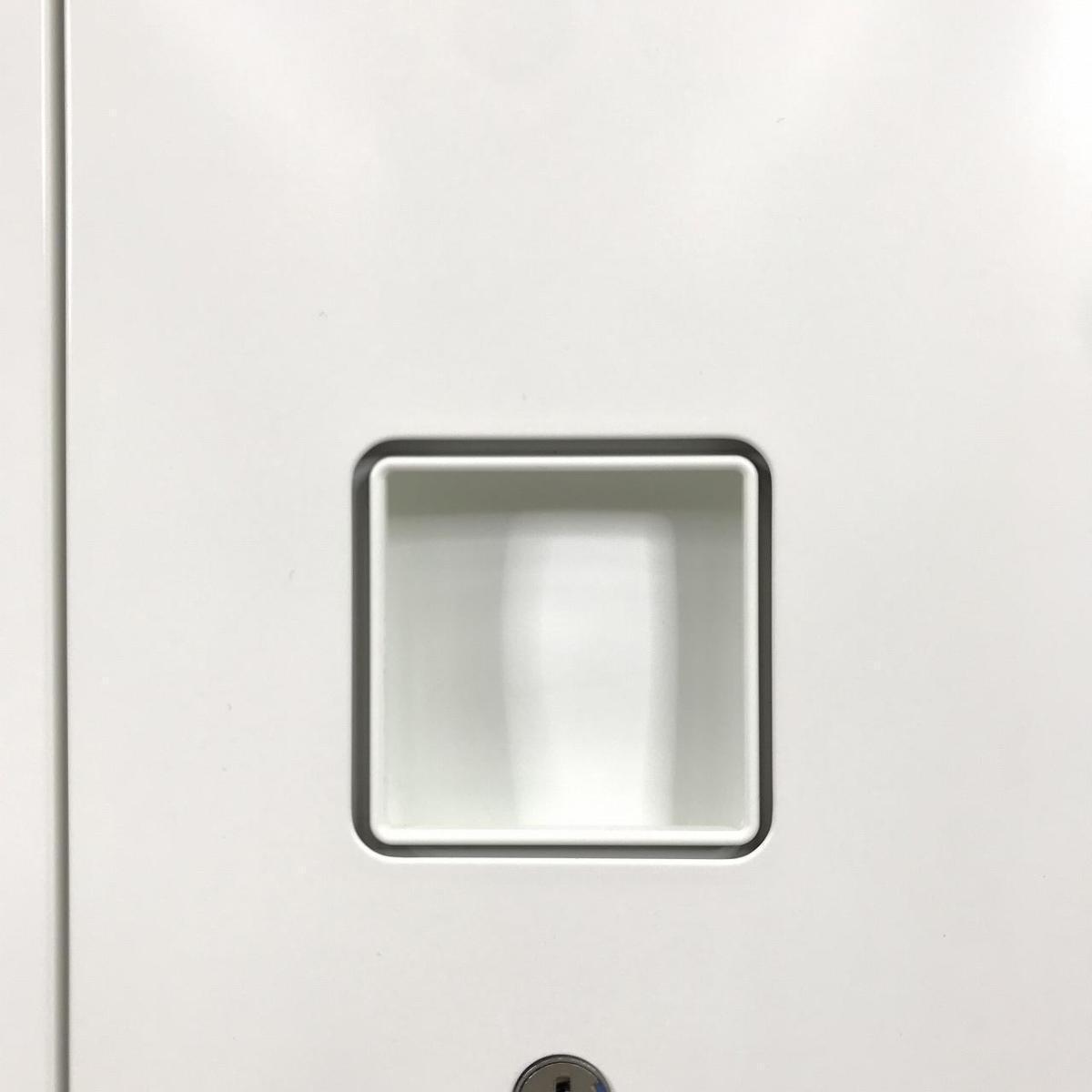 シンプルなスクエア型の把手は、レクトラインシリーズの書庫の特徴です。