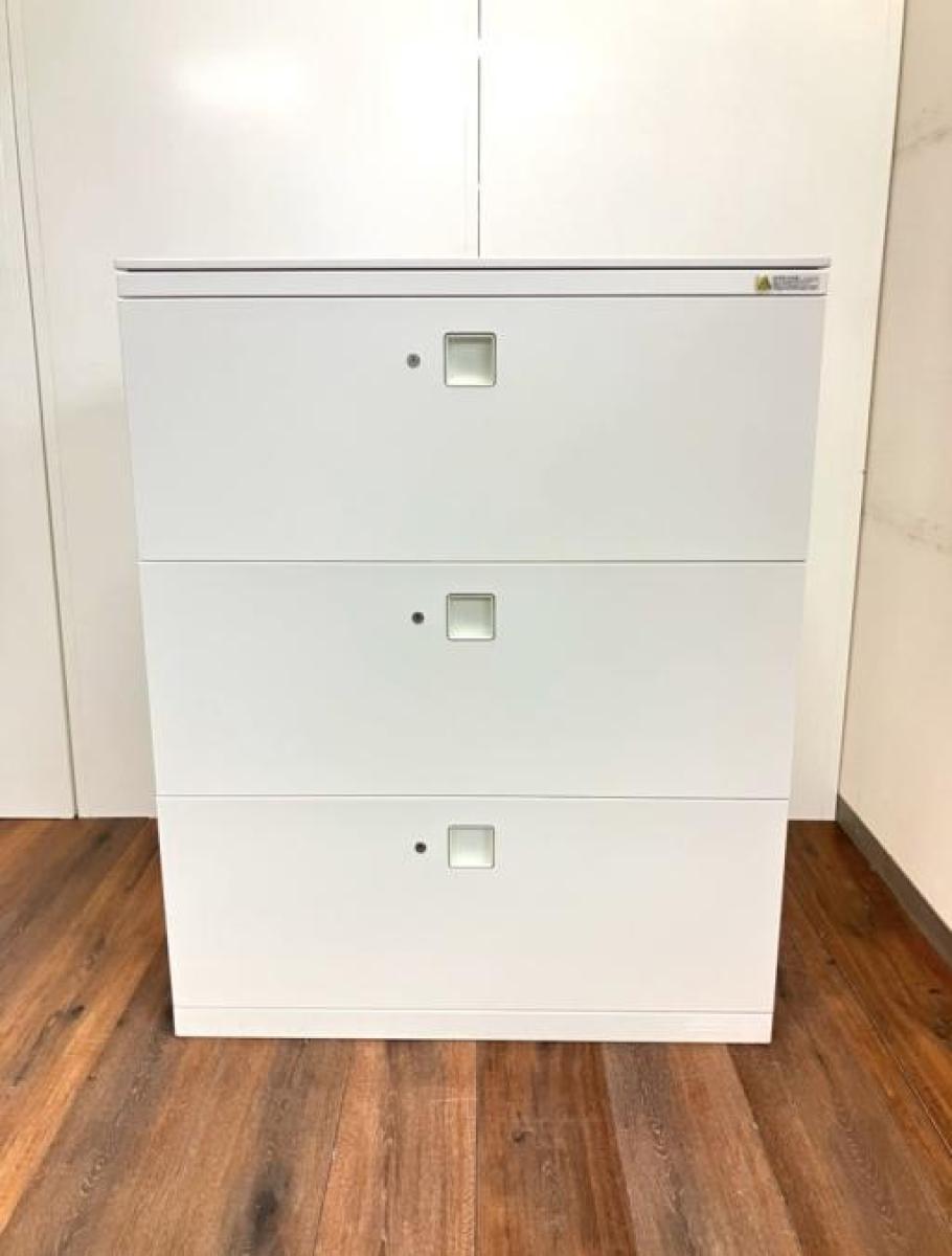 【使いやすさで選ぶならコレ!大容量の三段キャビネット】■オカムラ(Okamura)製 レクトラインシリーズ(Rectline) 3段ラテラル書庫 ローキャビネット ■天板付き ■シリンダー錠 ■ホワイト