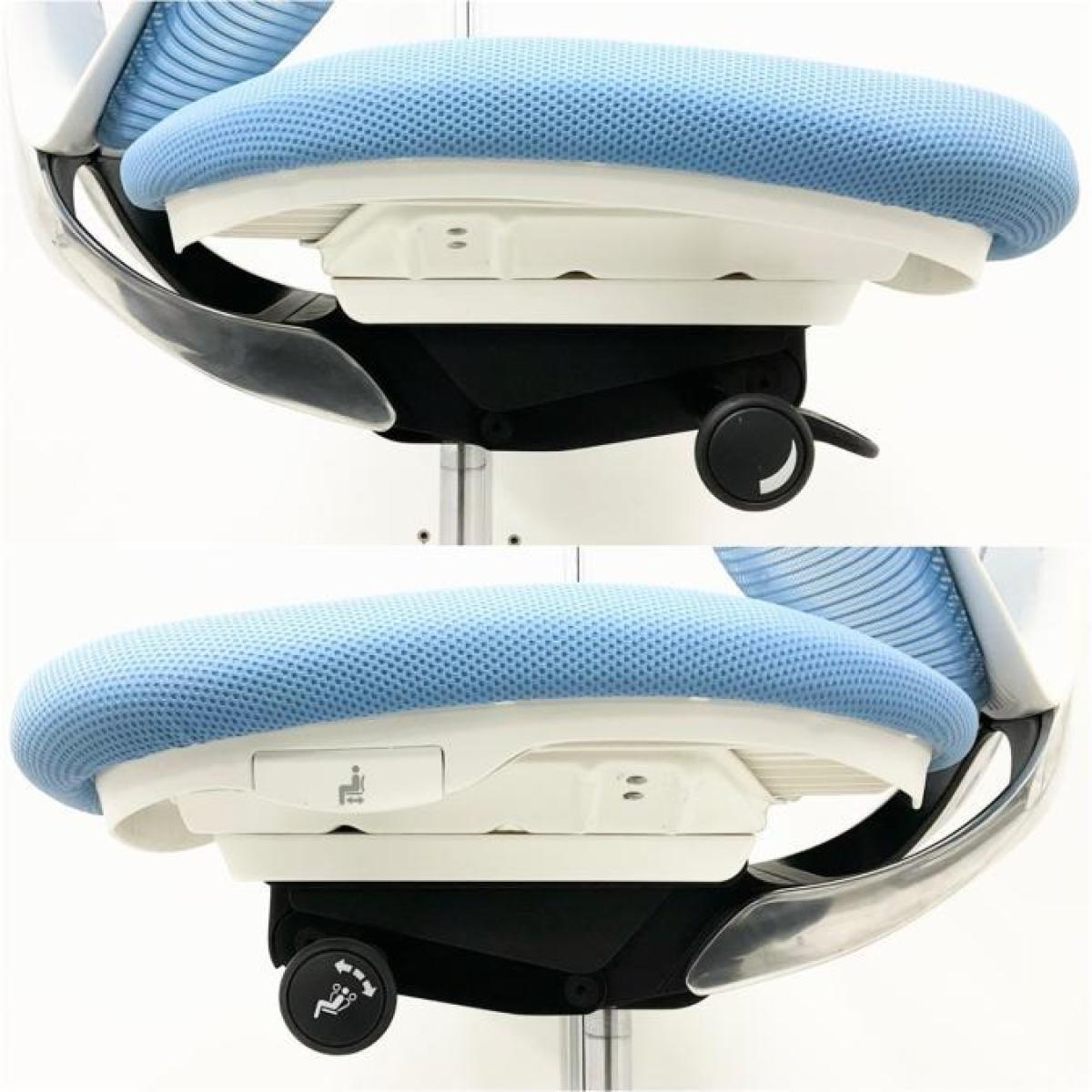 - 椅子と背が連動する「シンクロリクライニング」。リクライニング角度は直立ポジションから前方に10度、後方に23度です。