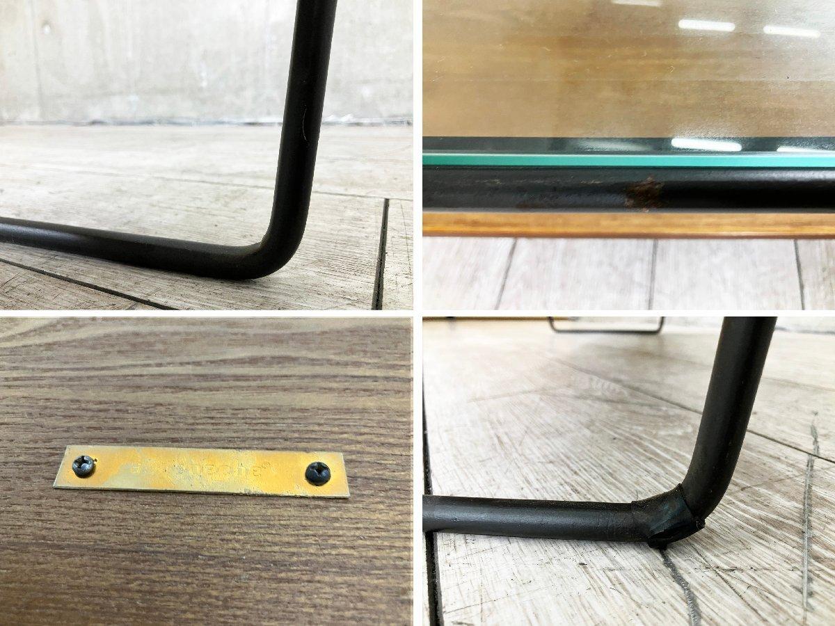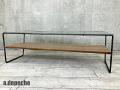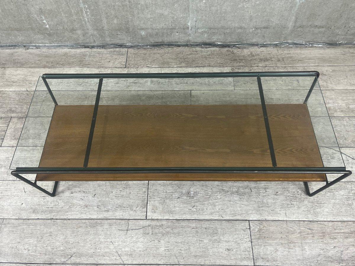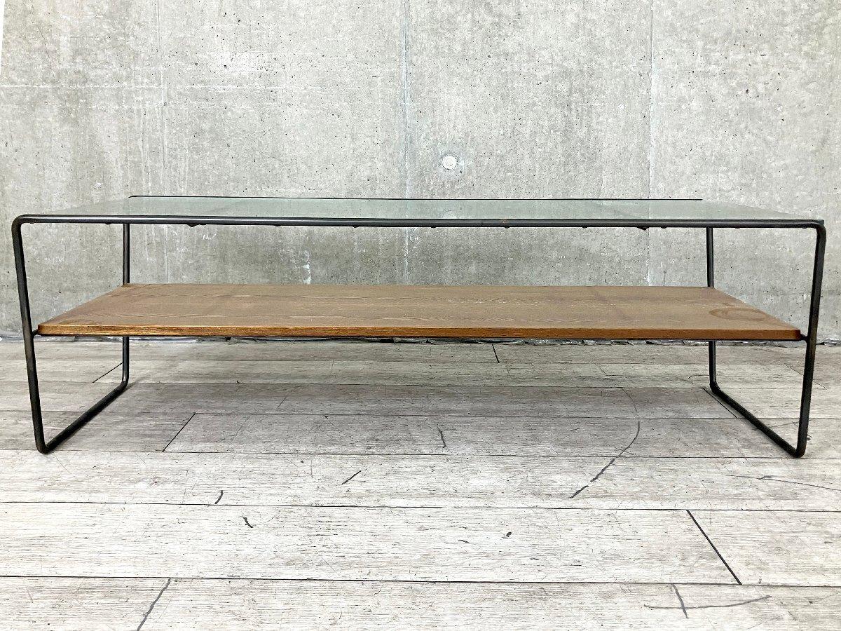 上段はガラス、下段にはアッシュ材を使用し、スチールパイプのフレームで一筆書きのように繋いでいます。華奢なようでいて重厚感がありますが、ガラス天板は圧迫感をあたえず空間を広く見せることができます。下段の棚板にはティッシュボックスやリモコンを収納しても便利ですし、雑誌などをディスプレイしていただくことも可能です。