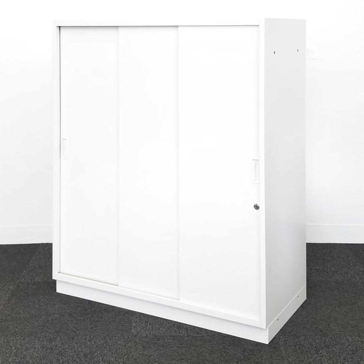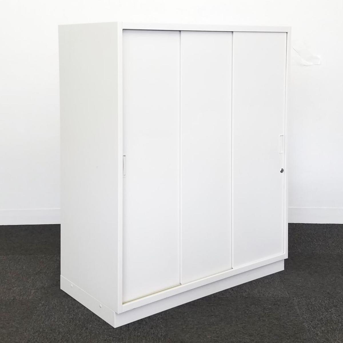 【スライド式なので開閉スペースに困りません!人気の3枚引き戸書庫!】■イトーキ (ITOKI)製 シンラインシリーズ 引き違い書庫 ローキャビネット 3枚引き戸 H1120㎜ ■天板付 ■ホワイト ■シリンダー錠
