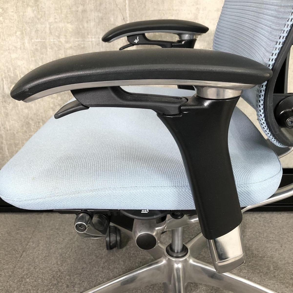【王道チェア!】■オカムラ製(okamura) コンテッサ (Contessa) ハイバック 肘付き ■ライトブルー ■背面メッシュ ■ランバーサポート付 ■可動肘