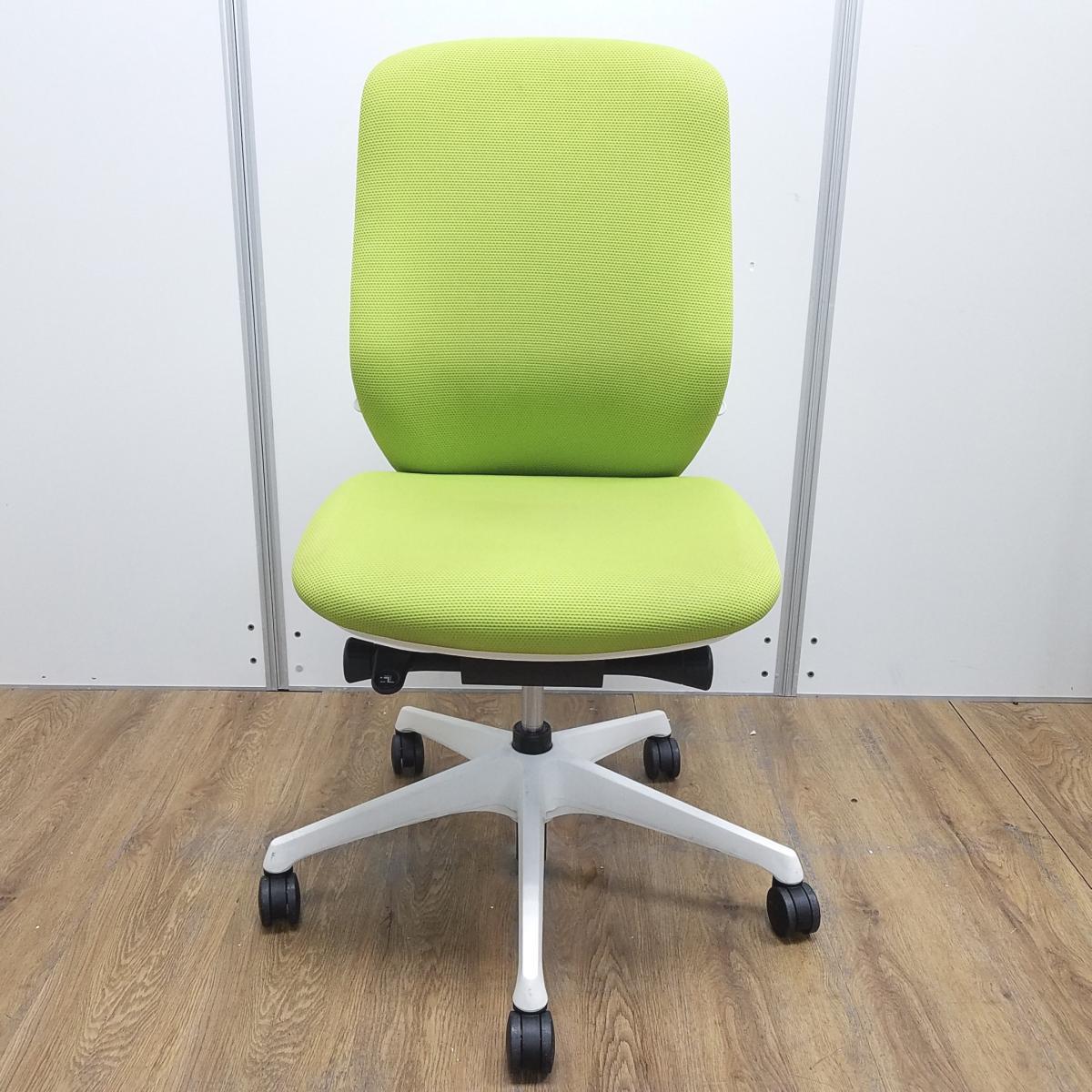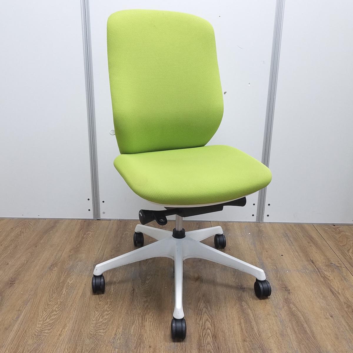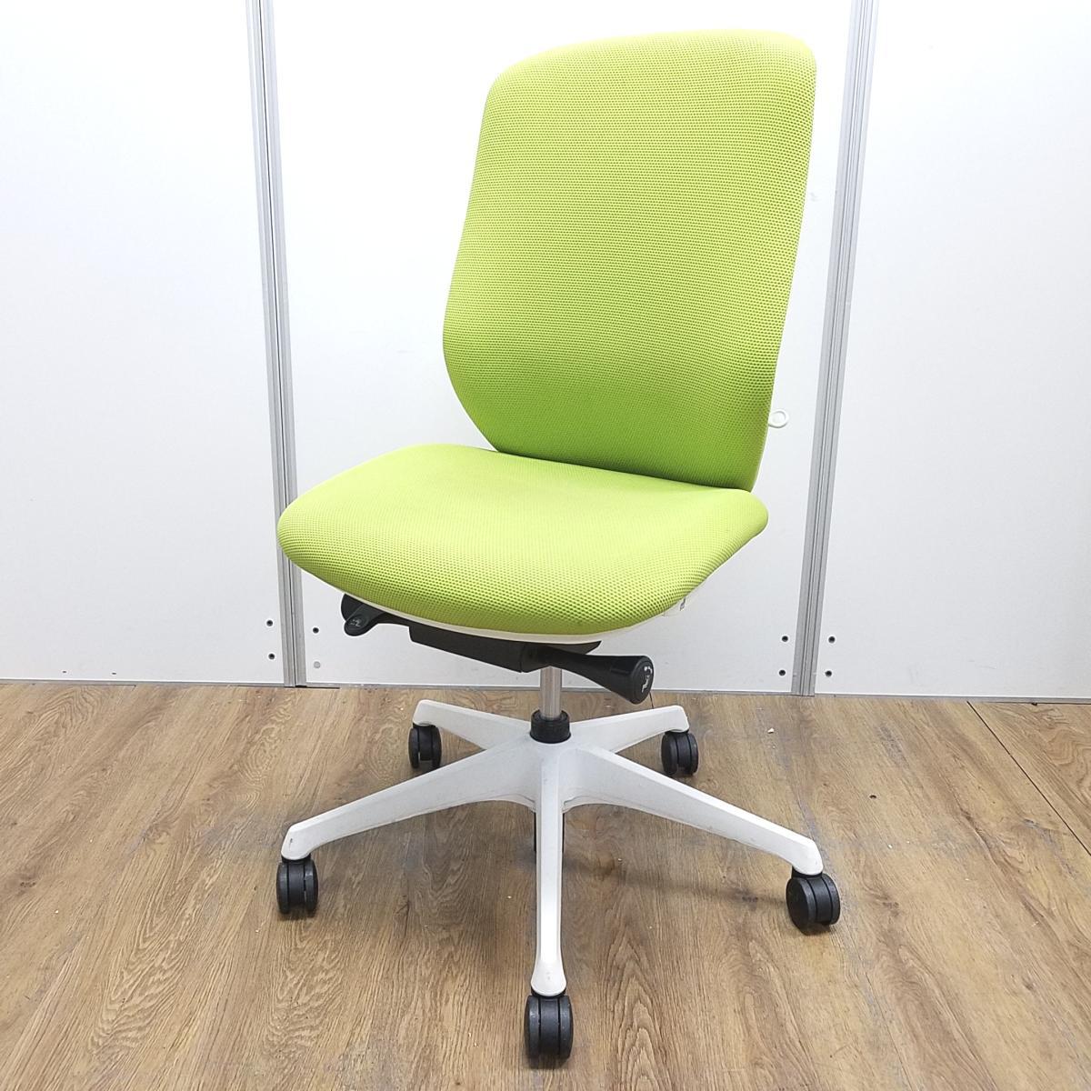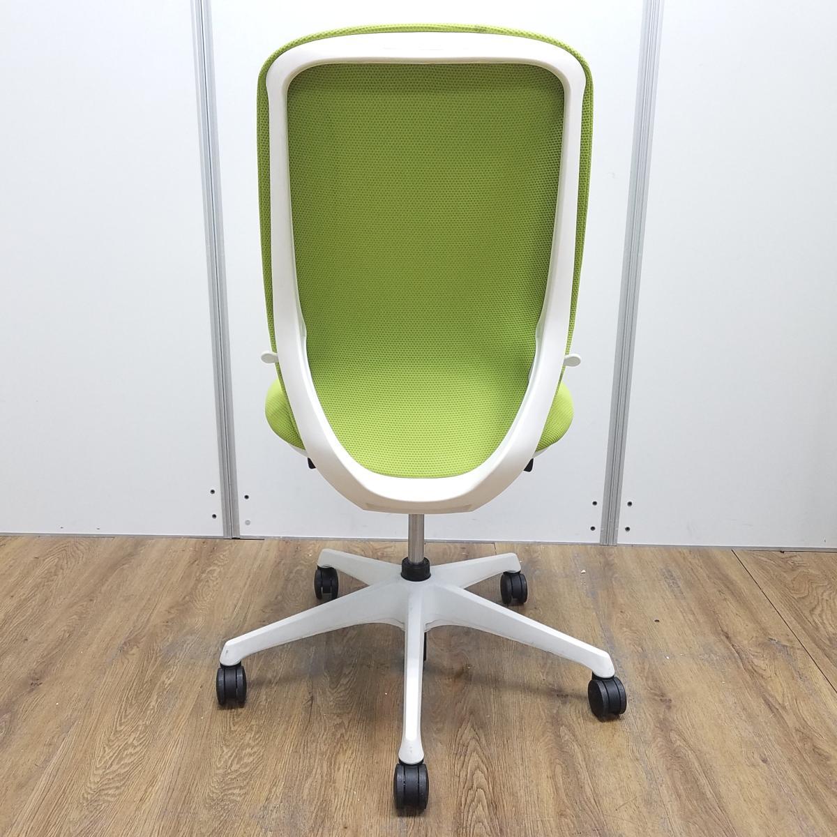 オカムラ製 シルフィーシリーズ ライムグリーン ホワイトフレーム 背面クッション コートハンガー付き 快適な座り心地を実現! 人気シリーズの背面クッションモデル! 肘無しハイバックチェア!!