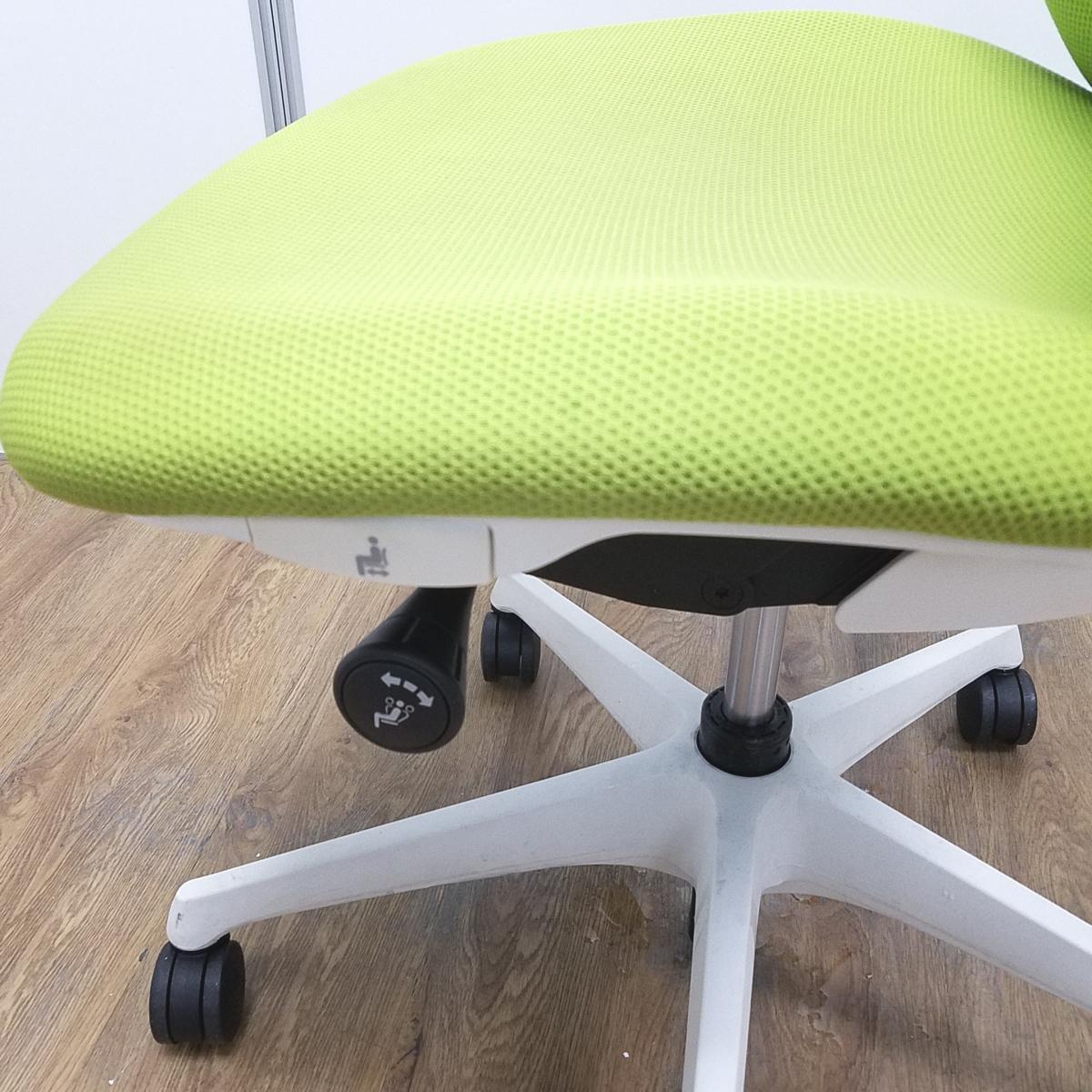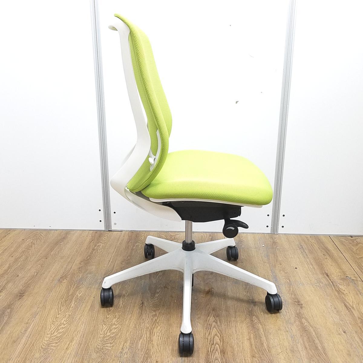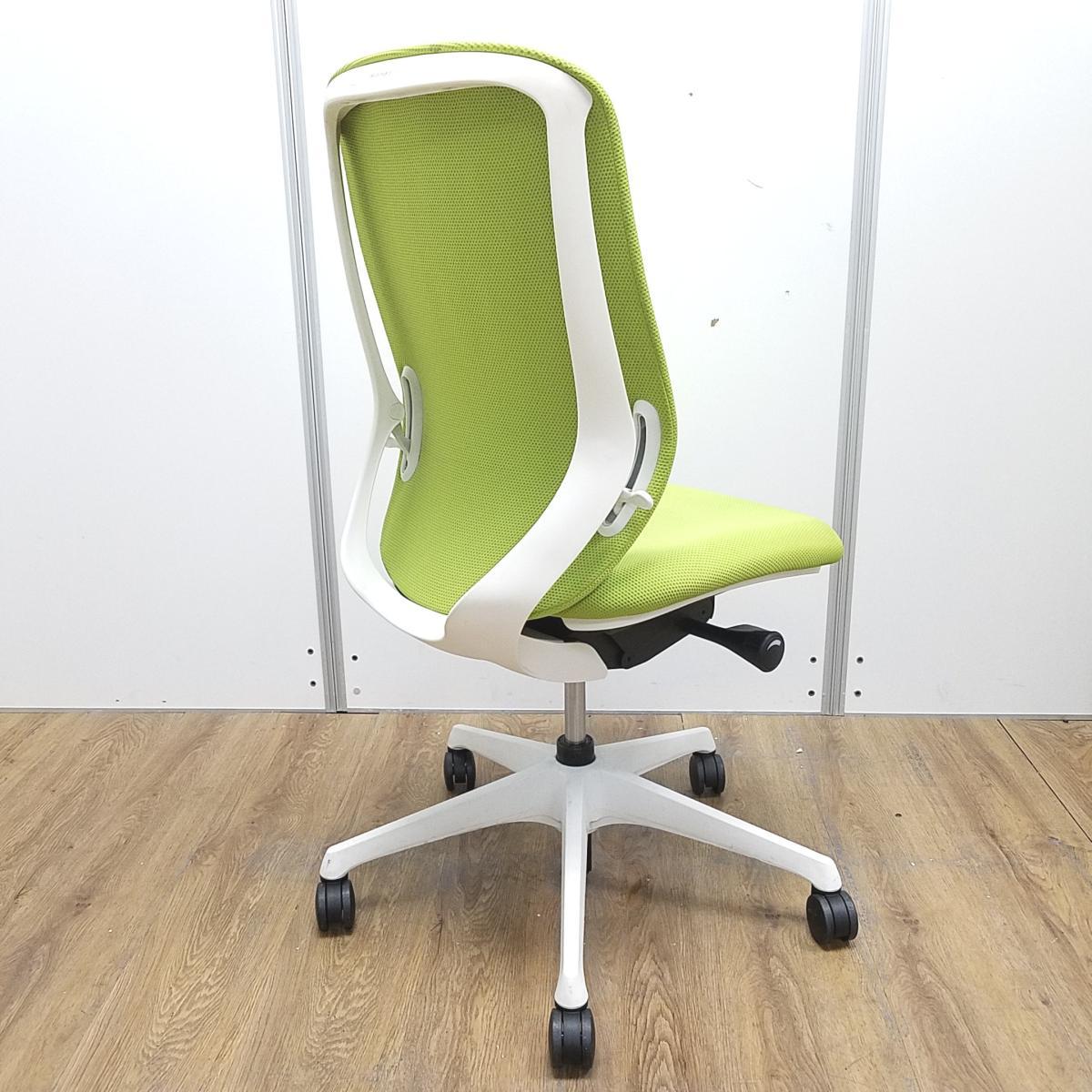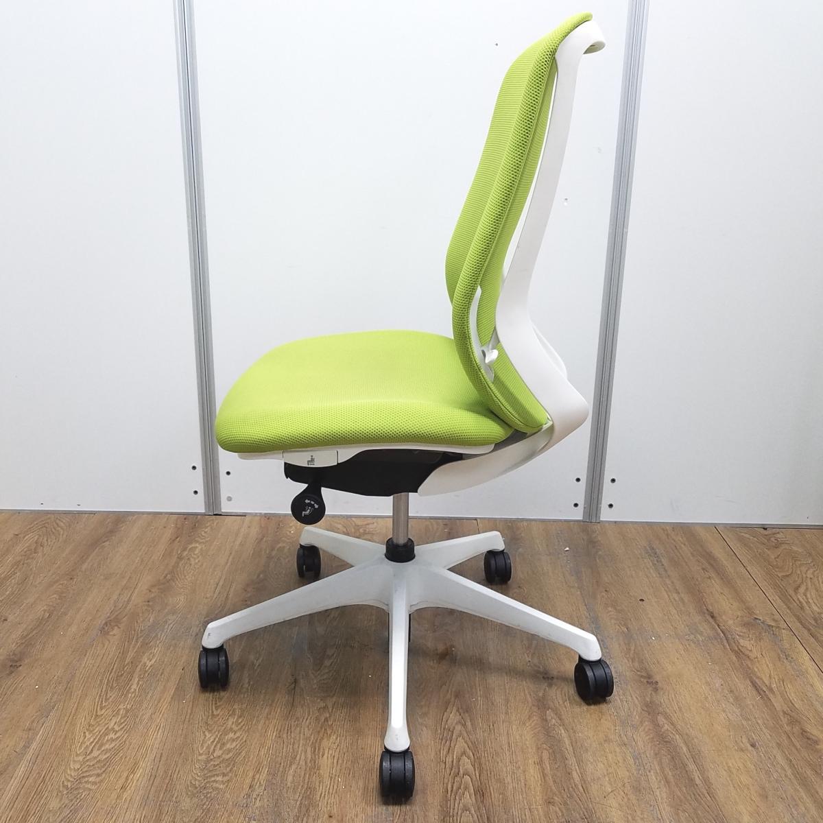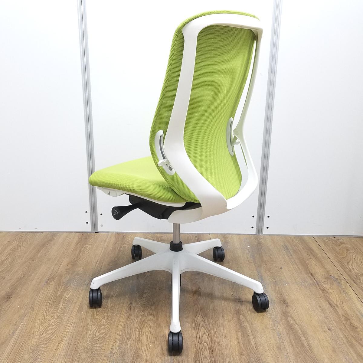 オカムラ製 シルフィーシリーズ ライムグリーン ホワイトフレーム 背面クッション コートハンガー付き 快適な座り心地を実現! 人気シリーズの背面クッションモデル! 肘無しハイバックチェア!!