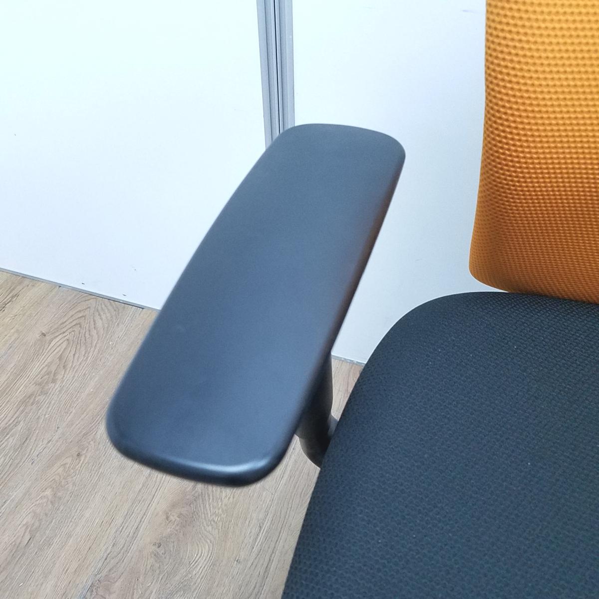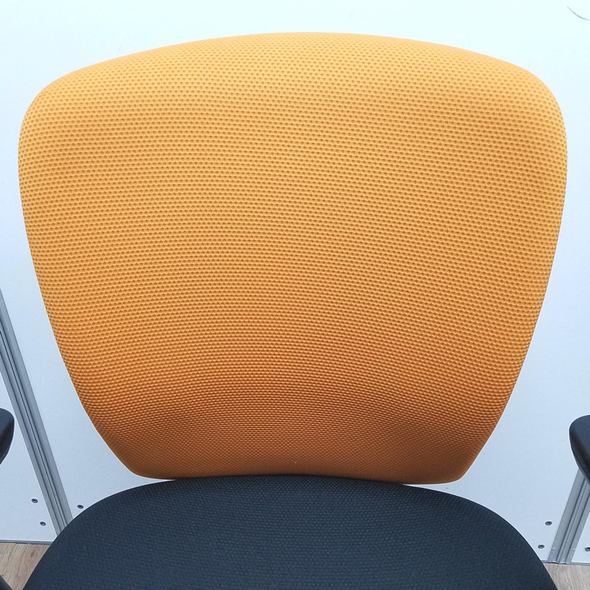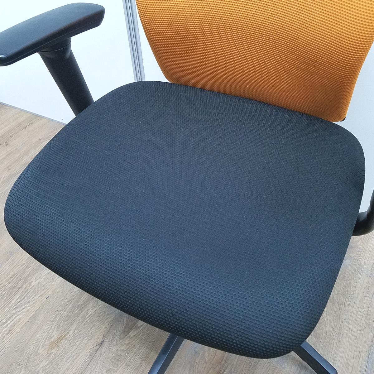 【K10】【商品入替のため、残り1脚限り】オカムラ製 スラート オレンジxブラック ブラックフレーム アジャストアーム※可動肘 ローバック シンプルなデザインと厚みのあるクッションが大人気! 機能充実のワーキングチェア! 肘付きローバックチェア!!サーキュラーバリューCO2削減量の算出について
