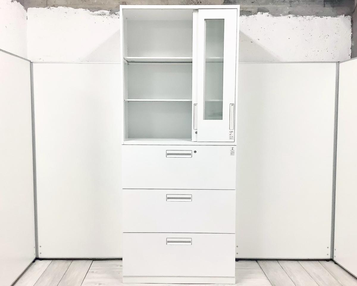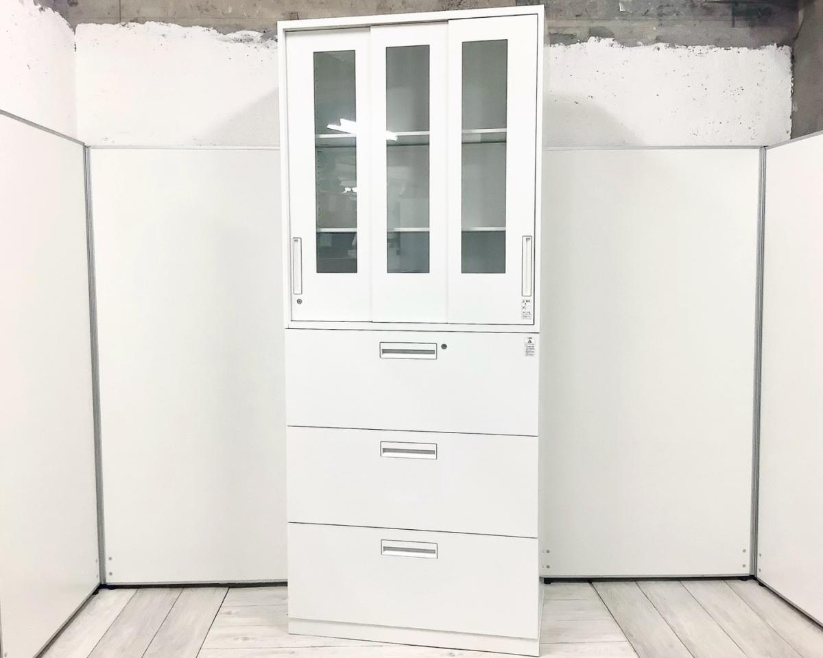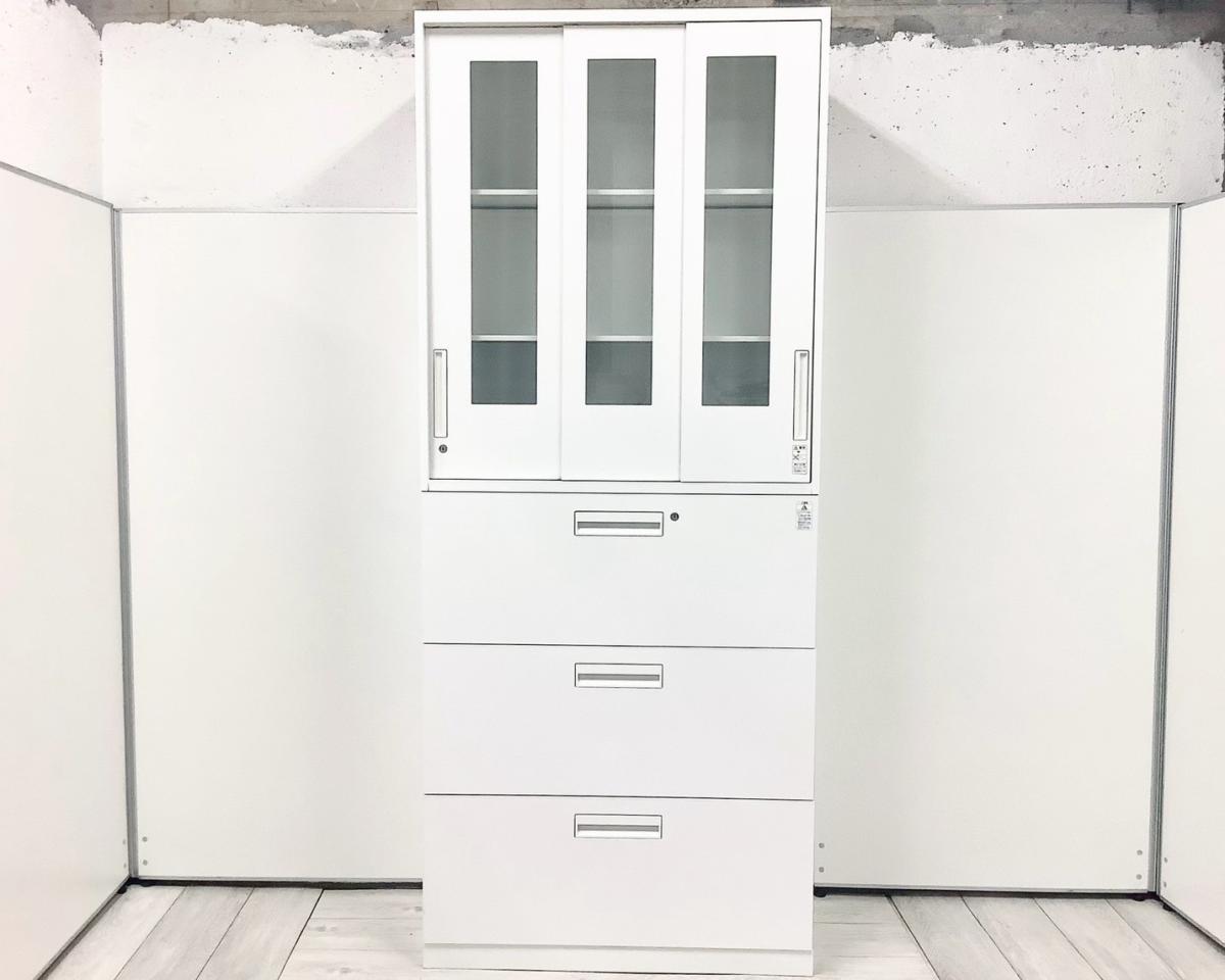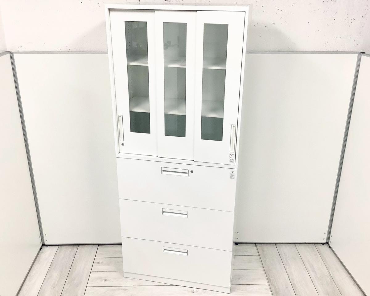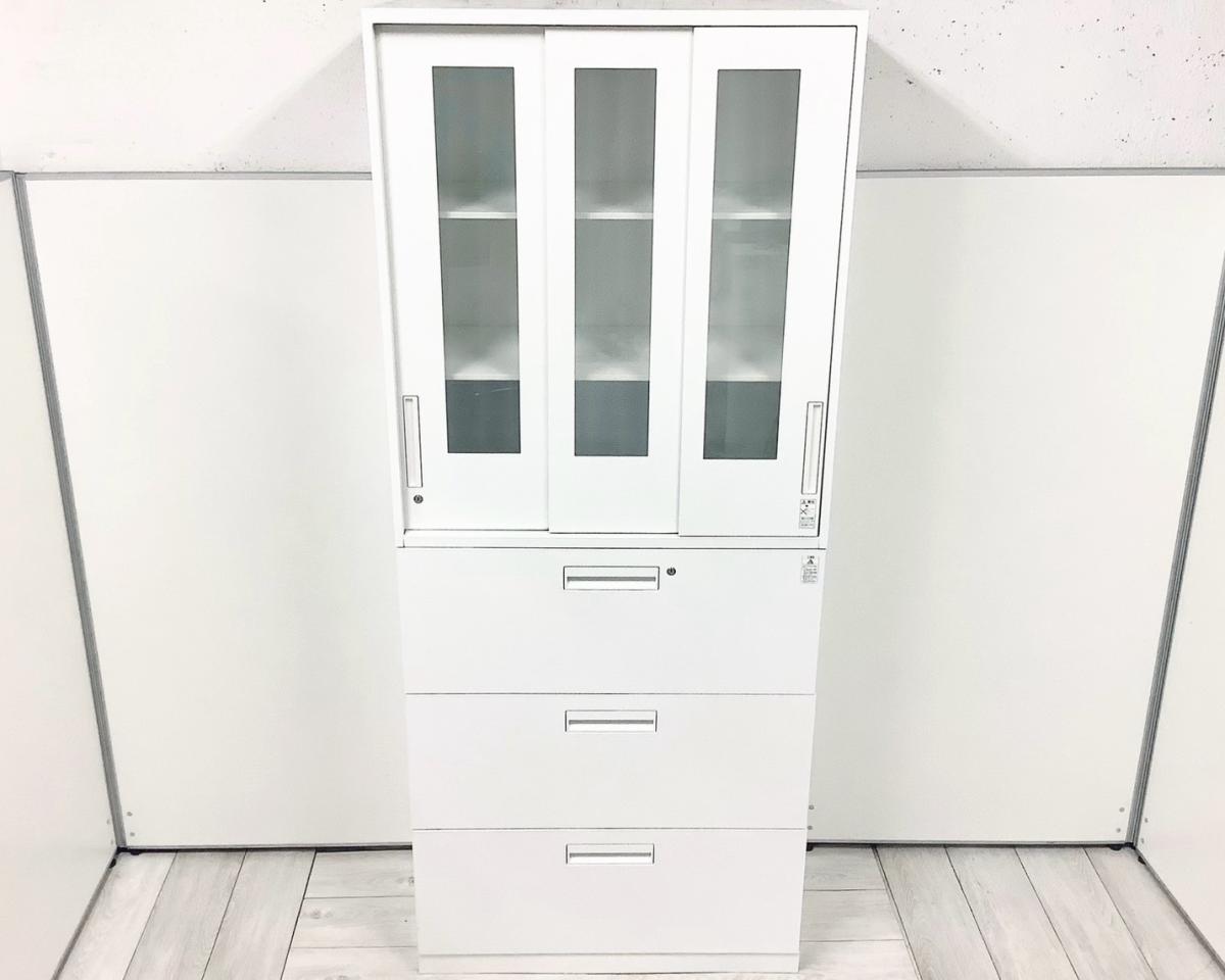 【オフィスの書類をまとめて整理!引き違いと引き出し式の書庫セット!】■コクヨ(KOKUYO)製 エディア(EDIA) 引き違い+3段ラテラル 上下書庫セット 2枚扉 H2150㎜ ■シリンダー錠 ■ホワイト
