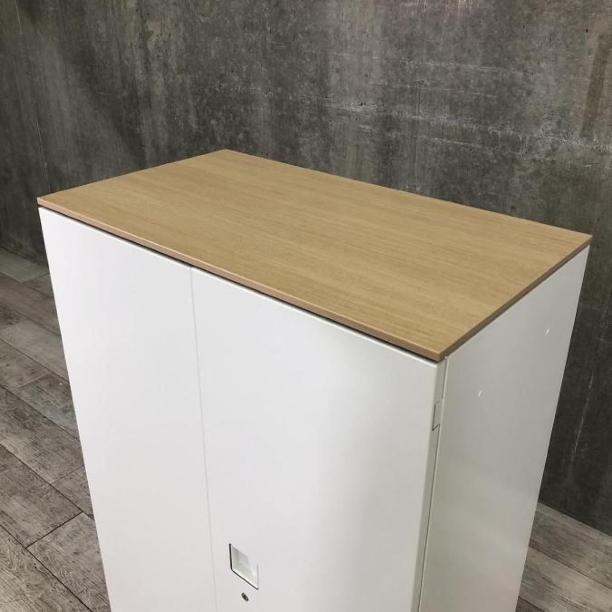 【オフィスの書類をスッキリ整理!取っ手がどの方向からでも開くマルチハンドル!】■オカムラ(okamura)製 レクトラインシリーズ 両開き書庫 ローキャビネット ■ナチュラル木目調天板付き ■本体色:ホワイト ■シリンダー錠サーキュラーバリューCO2削減量の算出について