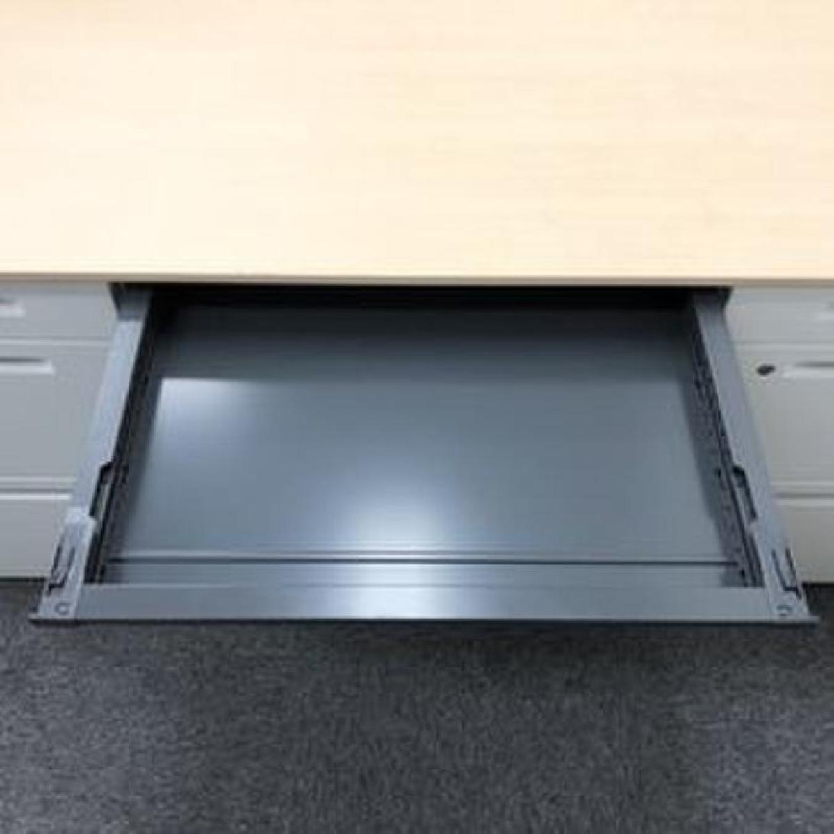 - 地震時、センター引出しが飛び出さないよう、ラッチ機構を装備。脚はデスクの横ズレを軽減させる設計になっています。
