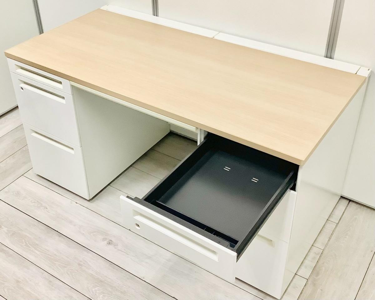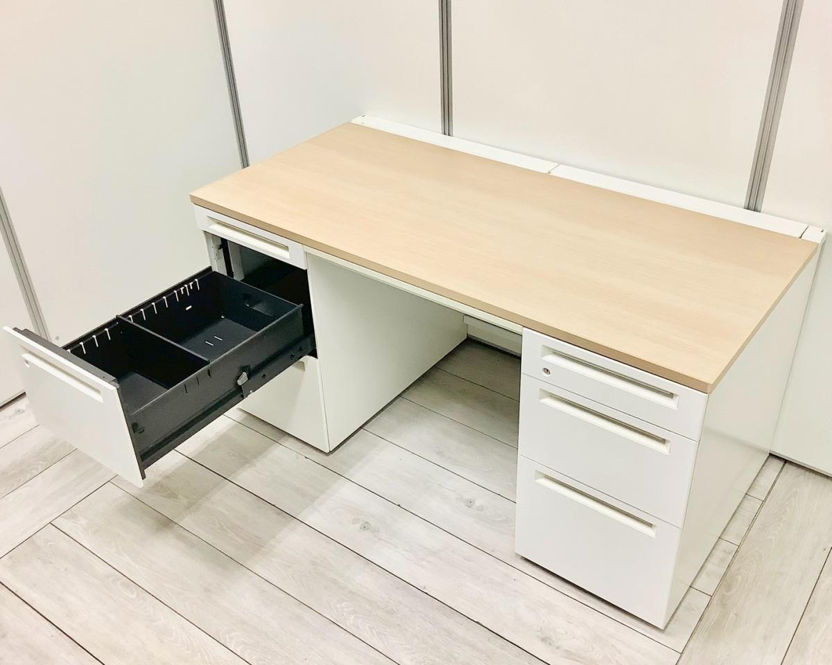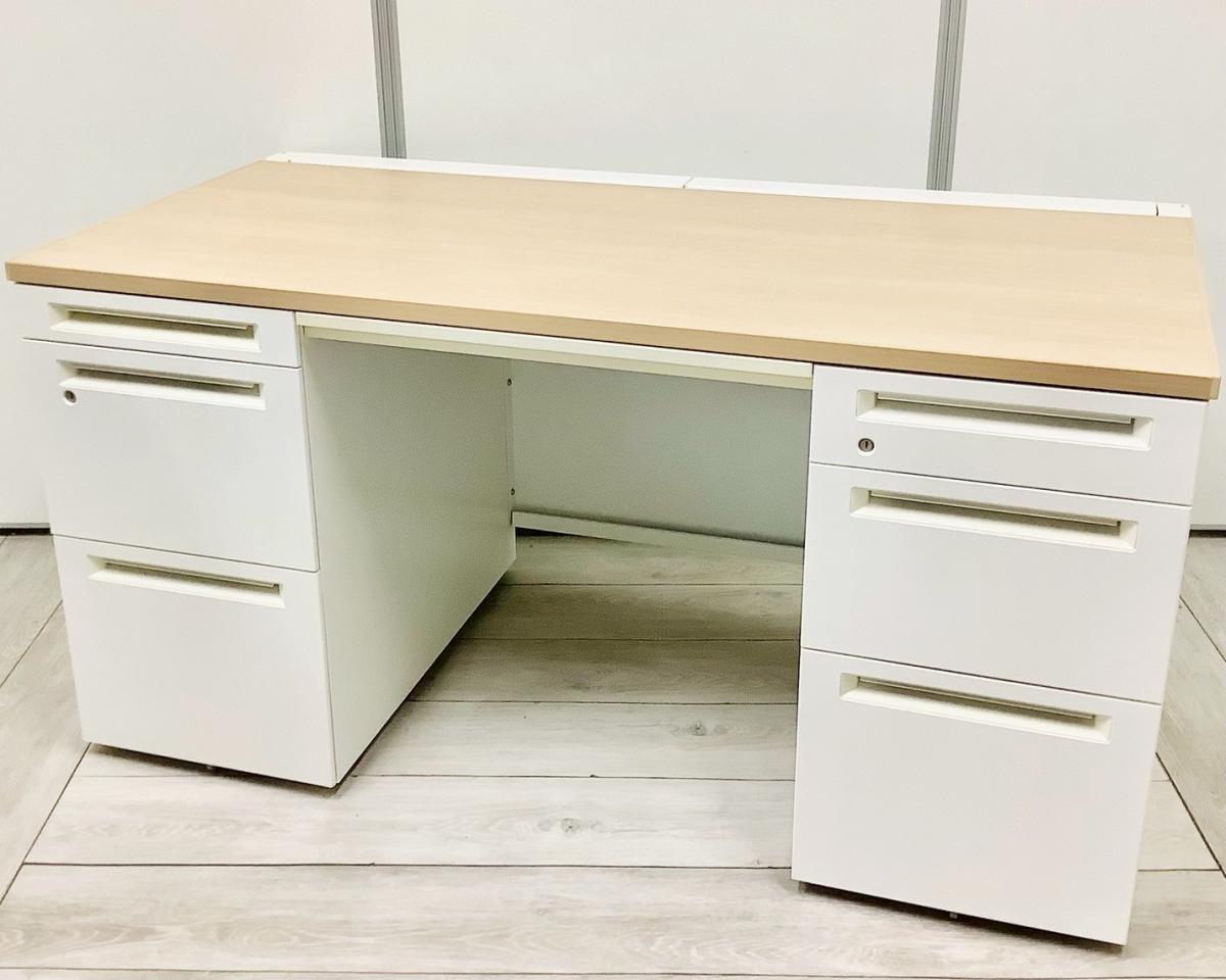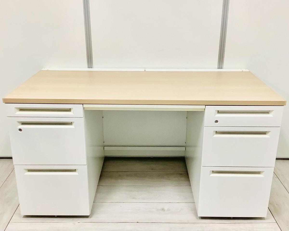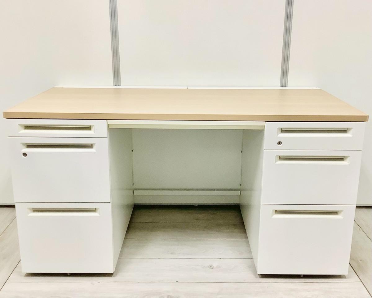 【訳あり品】両袖タイプで収納たっぷり!幅1400㎜でワークスペースもしっかり確保! ■オカムラ/アドバンス/天板ナチュラル/本体ネオホワイト 引出付き シリンダー錠 W1400×D700×H720㎜