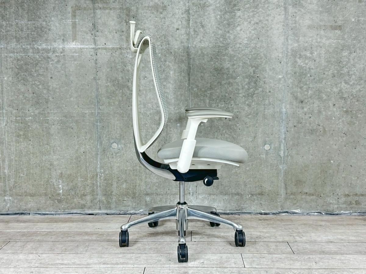 【前傾チルト付!流れるような美しいフォルムの最高級メッシュチェア!】■オカムラ(okamura)製 Sabrina(サブリナ)チェア 肘付ハイバック ■アジャストアーム(可動肘) ■背面メッシュ ■ライトグレー × ホワイトフレーム