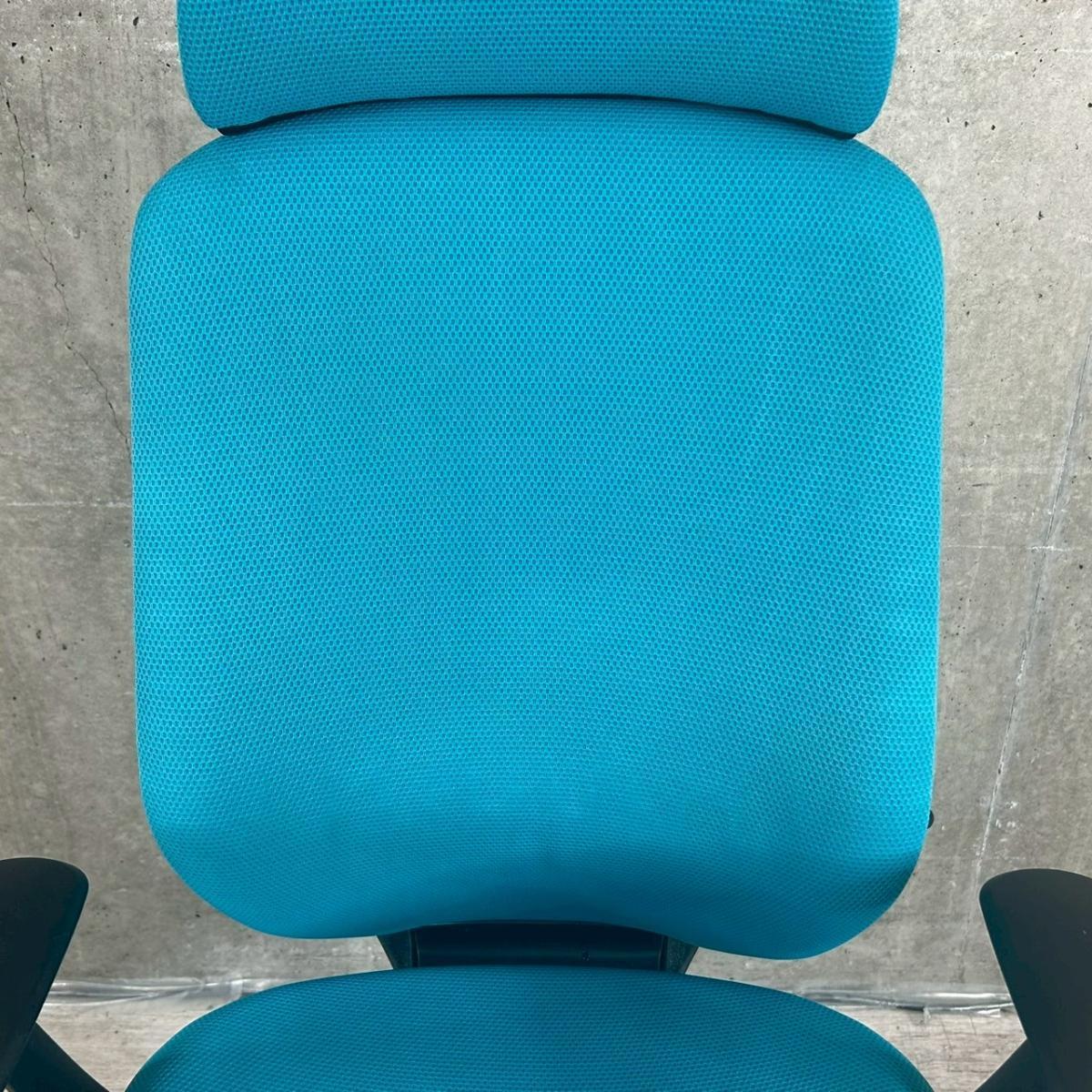 【背のカーブを変えられる!新感覚のオフィスシーティング!】■オカムラ(okamura)製 シルフィーチェア 肘付 エクストラハイバック ■固定肘/ヘッドレスト付 ■ブルーグリーン×ブラックシェル- つくば店