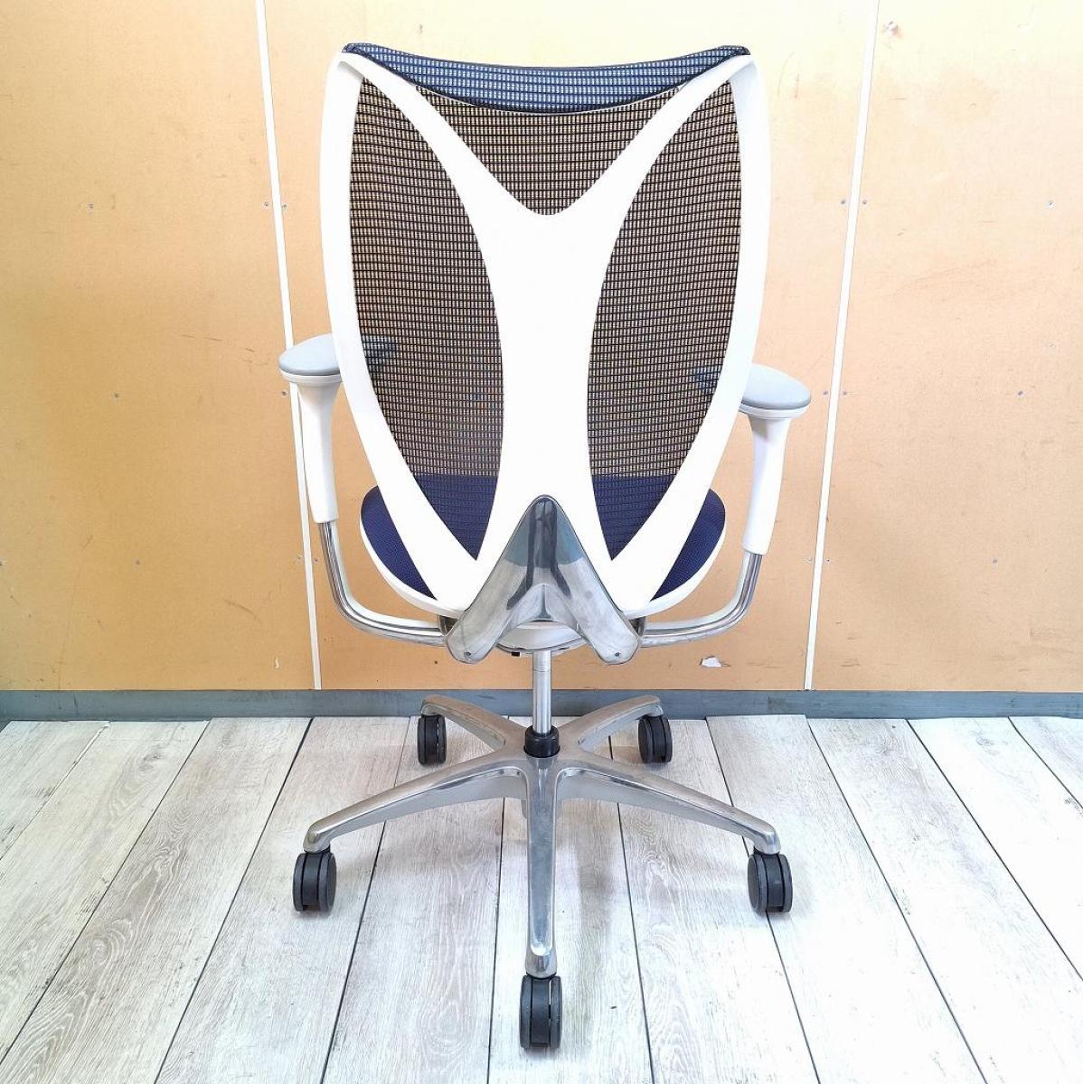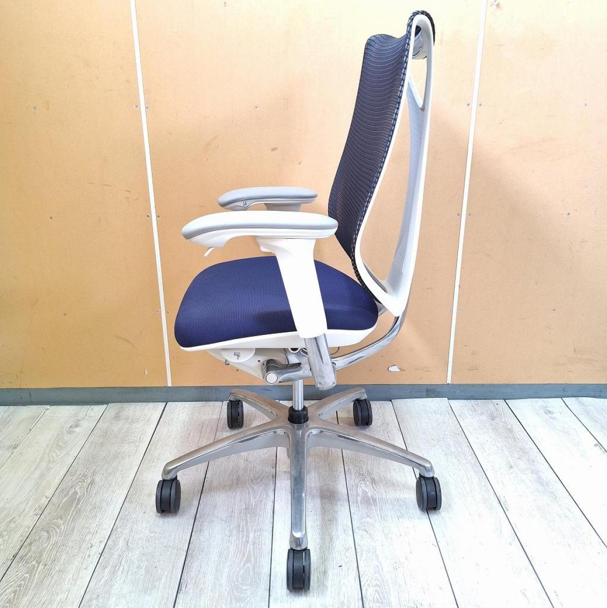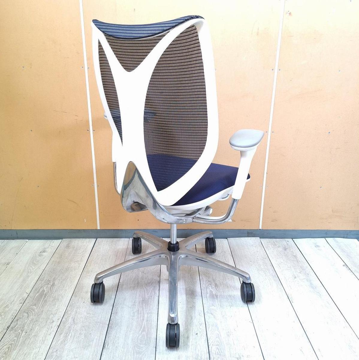 【前傾チルト付!流れるような美しいフォルムの最高級メッシュチェア!】■オカムラ(okamura)製 Sabrina(サブリナ) ハイバック 肘付き ■可動肘 ■背面メッシュ:アクアブルー 座面:ブルー ホワイトフレーム