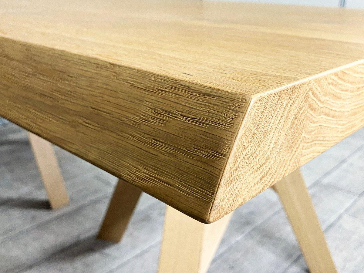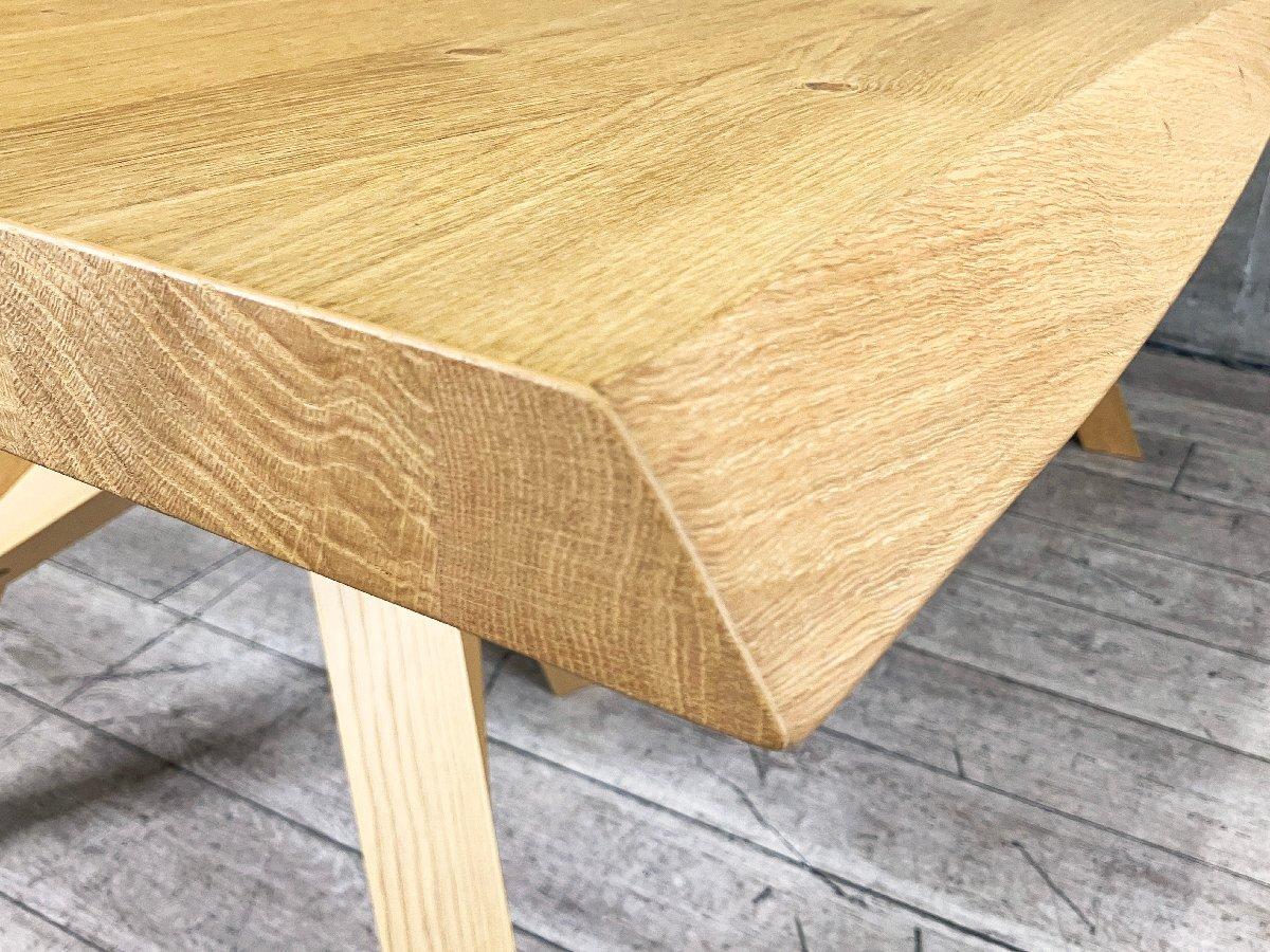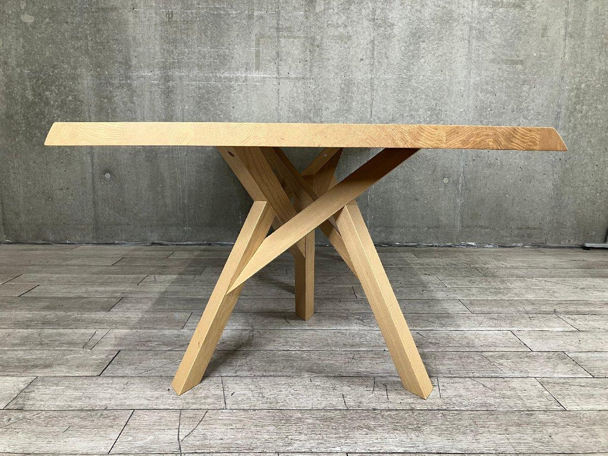 空間の主役となるテーブルです。天板のエッジは無垢一枚板のライブエッジを模した不規則で緩やかな曲線を描いています