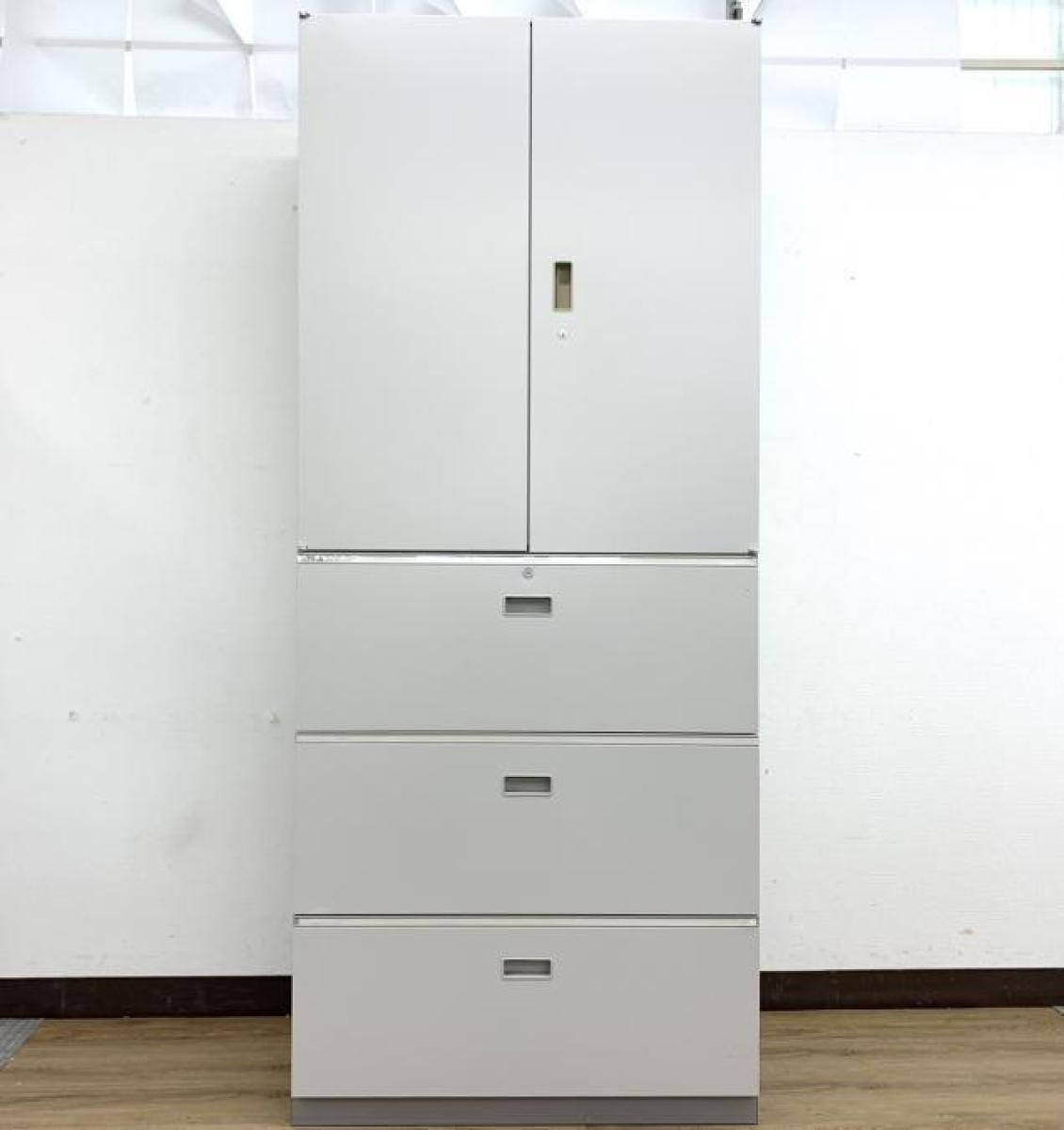【倉庫在庫品】【これ1台で書類整理の問題が解決!上下で6段分の大容量収納!】■イトーキ (ITOKI)製 シンライン ハイキャビネット 両開き+3段ラテラル 書庫セット ■グレー ■シリンダー錠