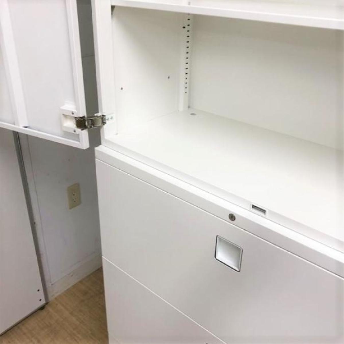 オカムラ レクトラインシリーズ 3段ラテラル+両開き扉の書庫セット ホワイト シリンダー錠 鍵付き 人気かつ定番商品 書類保管におすすめ ※取っ手日焼け・ヒンジカバー不足ありのため特価在庫がある店舗一覧