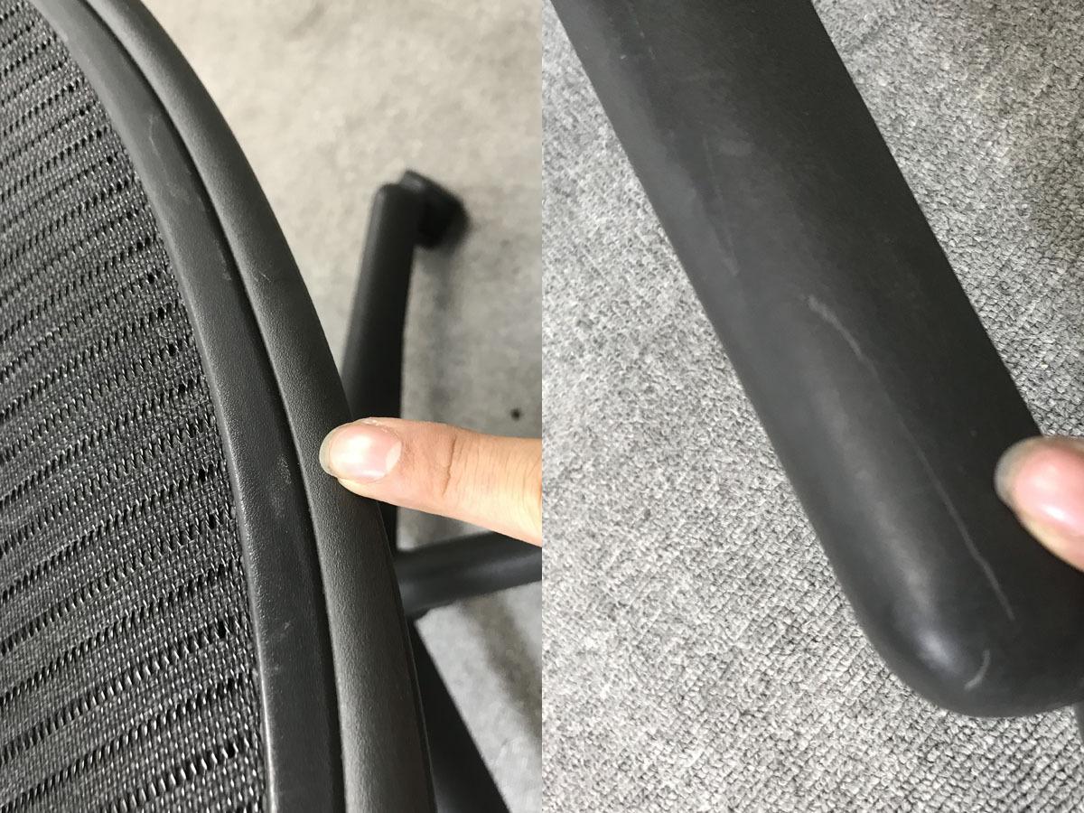 - 目立つ箇所あり傷・破れ・ほつれ・へたり・しわが多数または深い傷・破れ・ほつれ・へたり・しわが一部ある。※座面・背もたれ、シェル、脚部等にある。