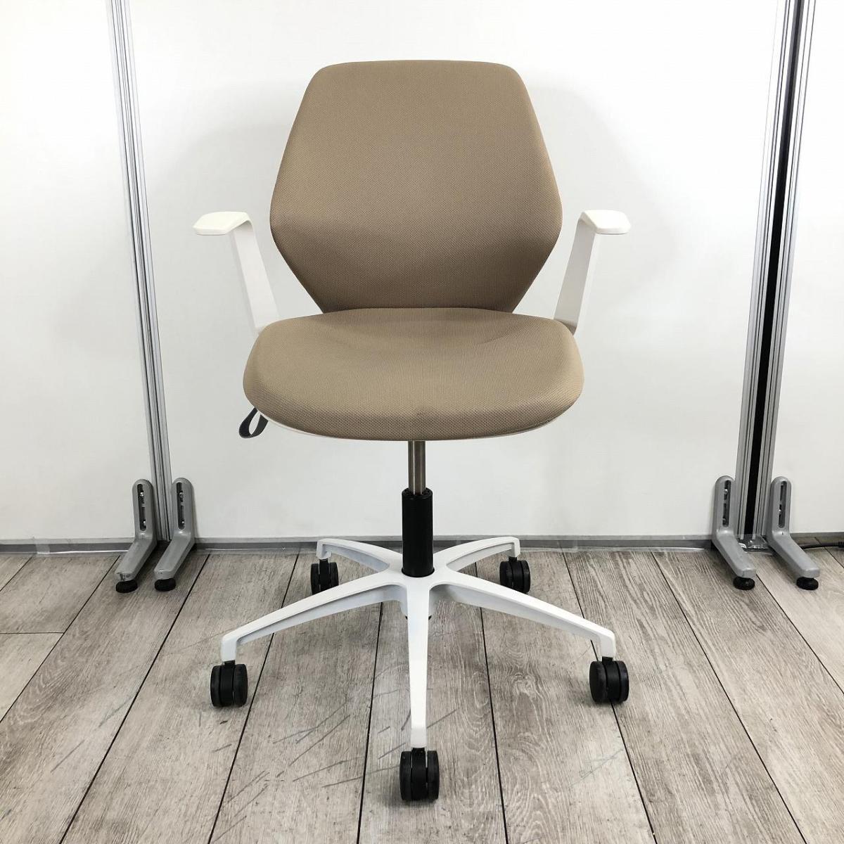【オフィスに新しい風を吹き込むライトタスクチェア!】【腰回りをしっかりサポート!】■イトーキ製(ITOKI)製 キュアチェア(QuA) 肘付き ミーティングチェア 5本脚 クロスバックタイプ ■固定肘 ■サンドイエロー(ライトブラウン)※ほつれ有- つくば店