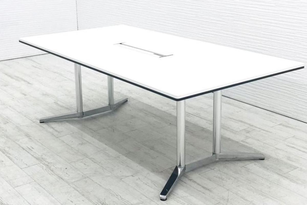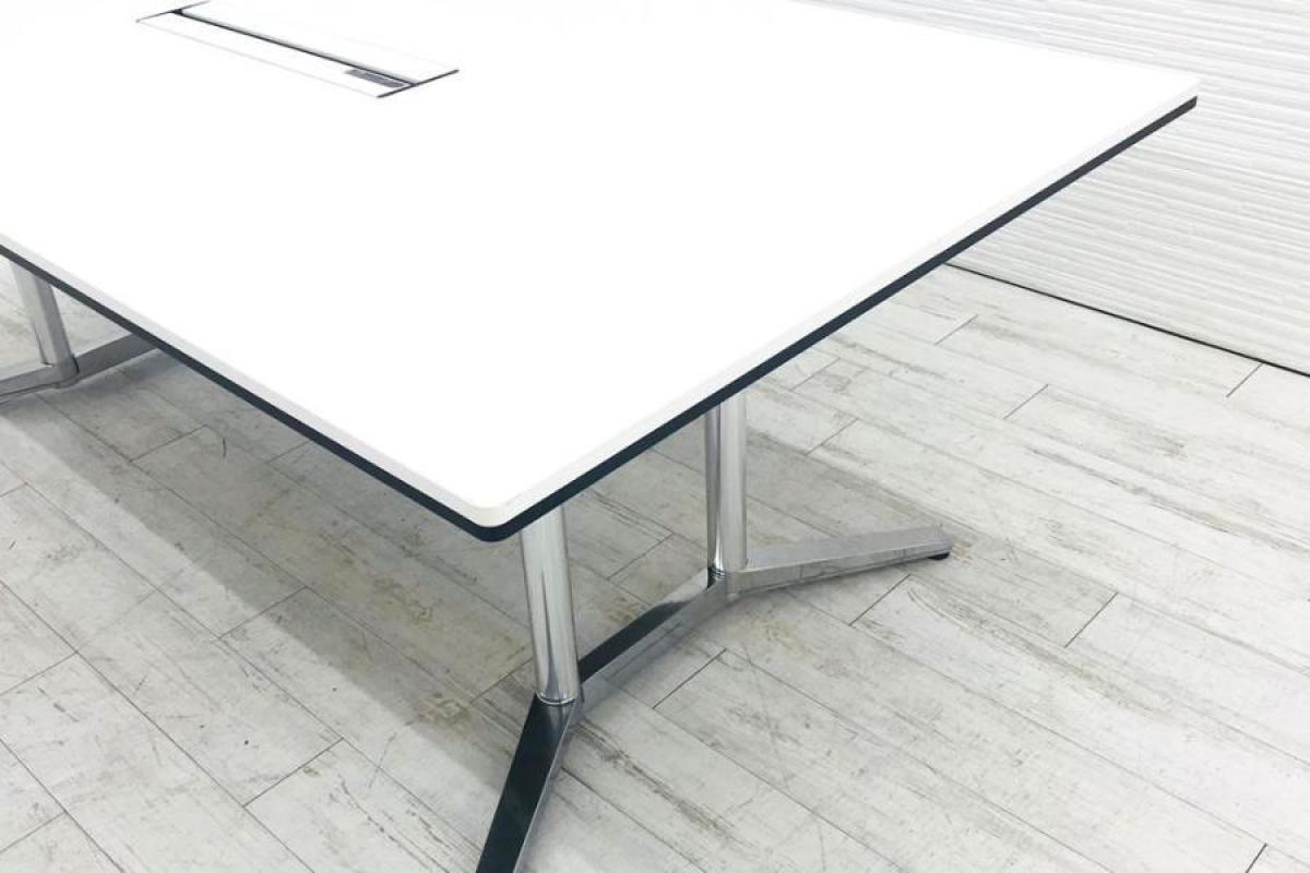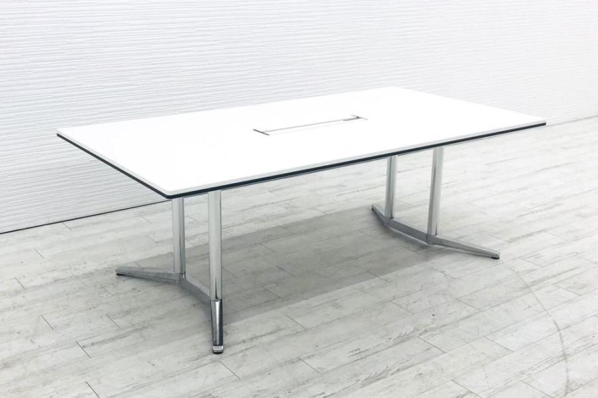 【在庫入替セール】【1台限定】高級会議テーブル 配線ダクト付き ポリッシュ脚/ホワイト天板【ラティオ】W2100×D1100【T8】- 神戸・三宮店