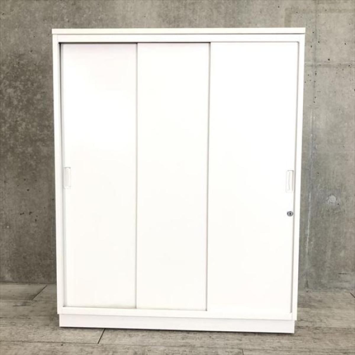 【スライド式なので開閉スペースに困りません!人気の3枚引き戸書庫!】■イトーキ (ITOKI)製 シンラインシリーズ 引き違い書庫 ローキャビネット 3枚引き戸 H1120㎜ ■天板付 ■ホワイト ■シリンダー錠