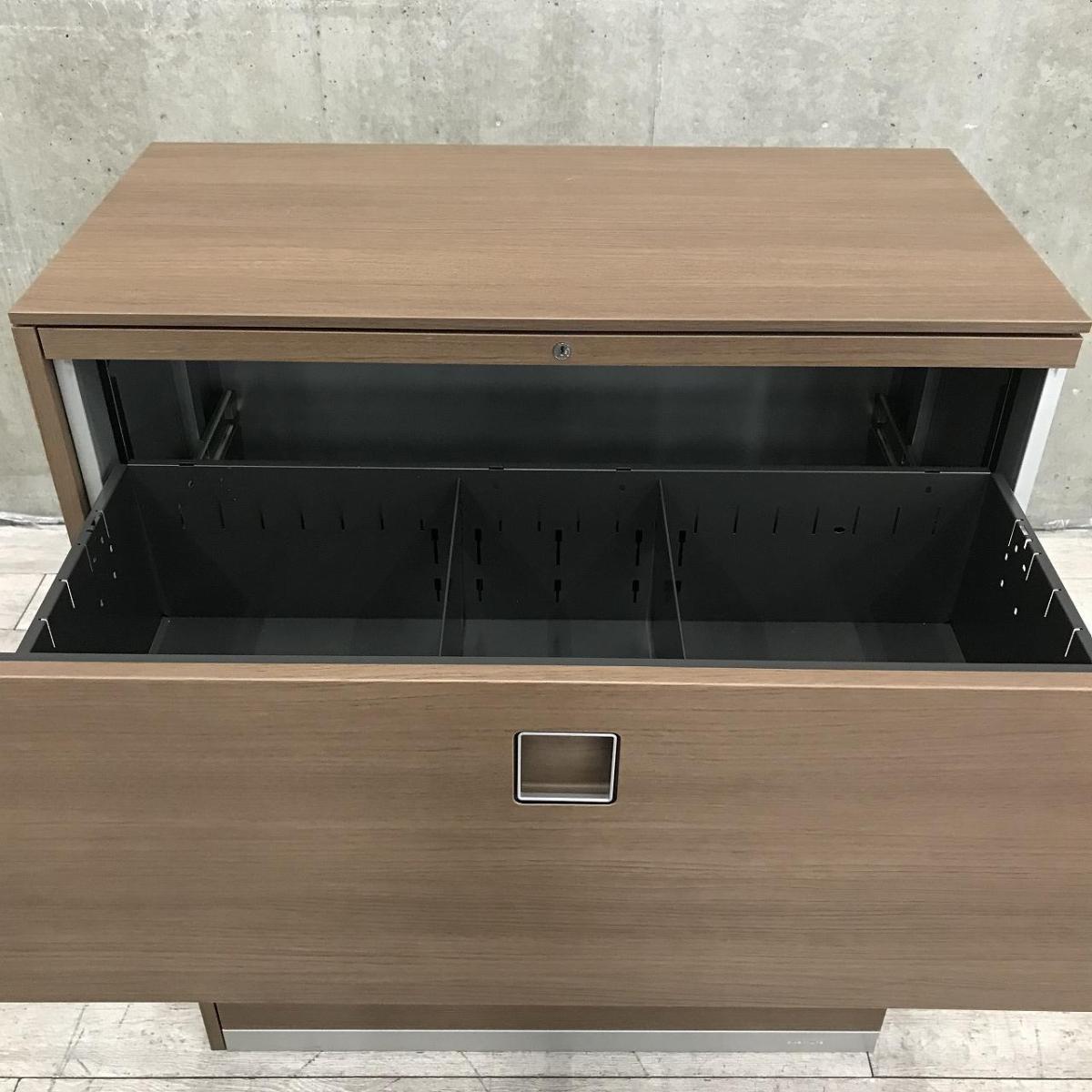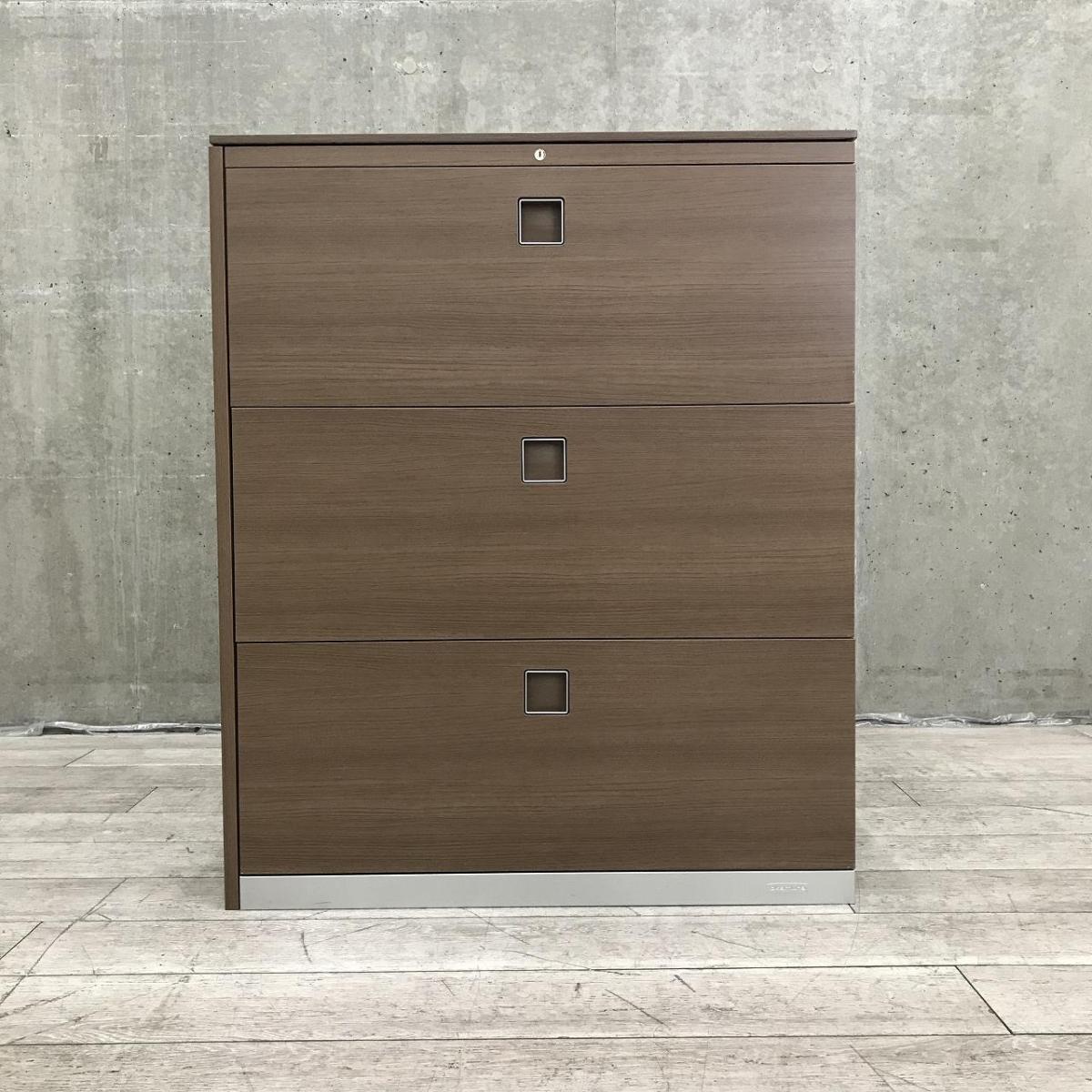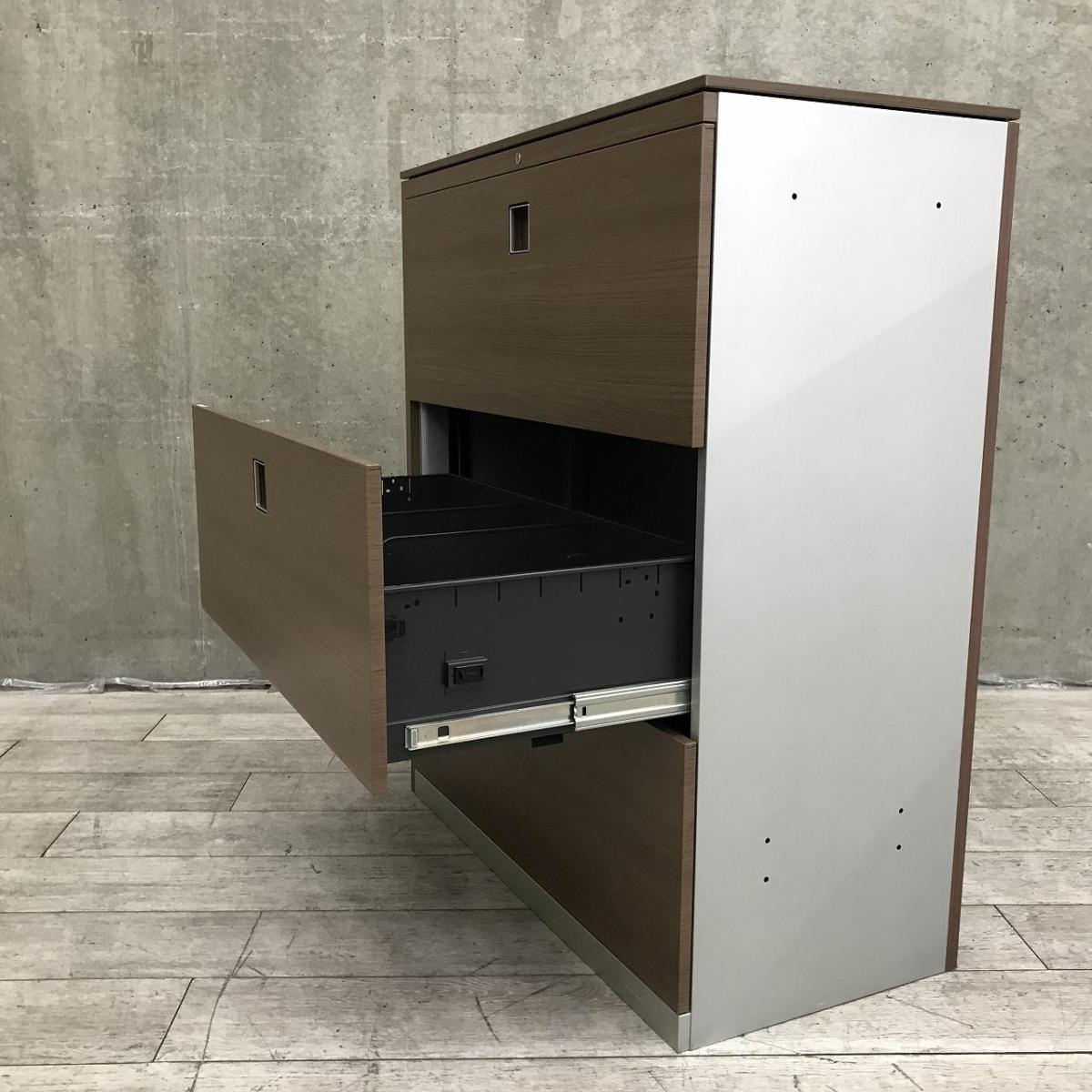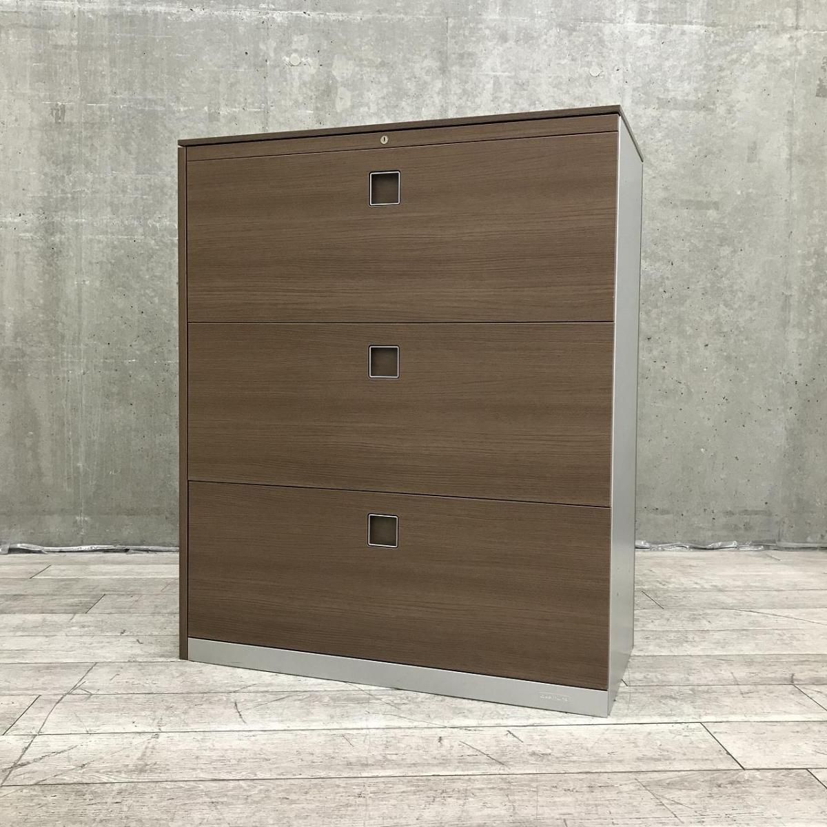 【西】【珍しいカラーリング!高品質で使いやすい人気の3段引き出し式書庫!】■オカムラ(okamura)製 レクトラインシリーズ 3段ラテラル書庫 ローキャビネット ■本体:シルバー 天板・正面・背面:木目調ブラウン 左側面:化粧板付 ■シリンダー錠