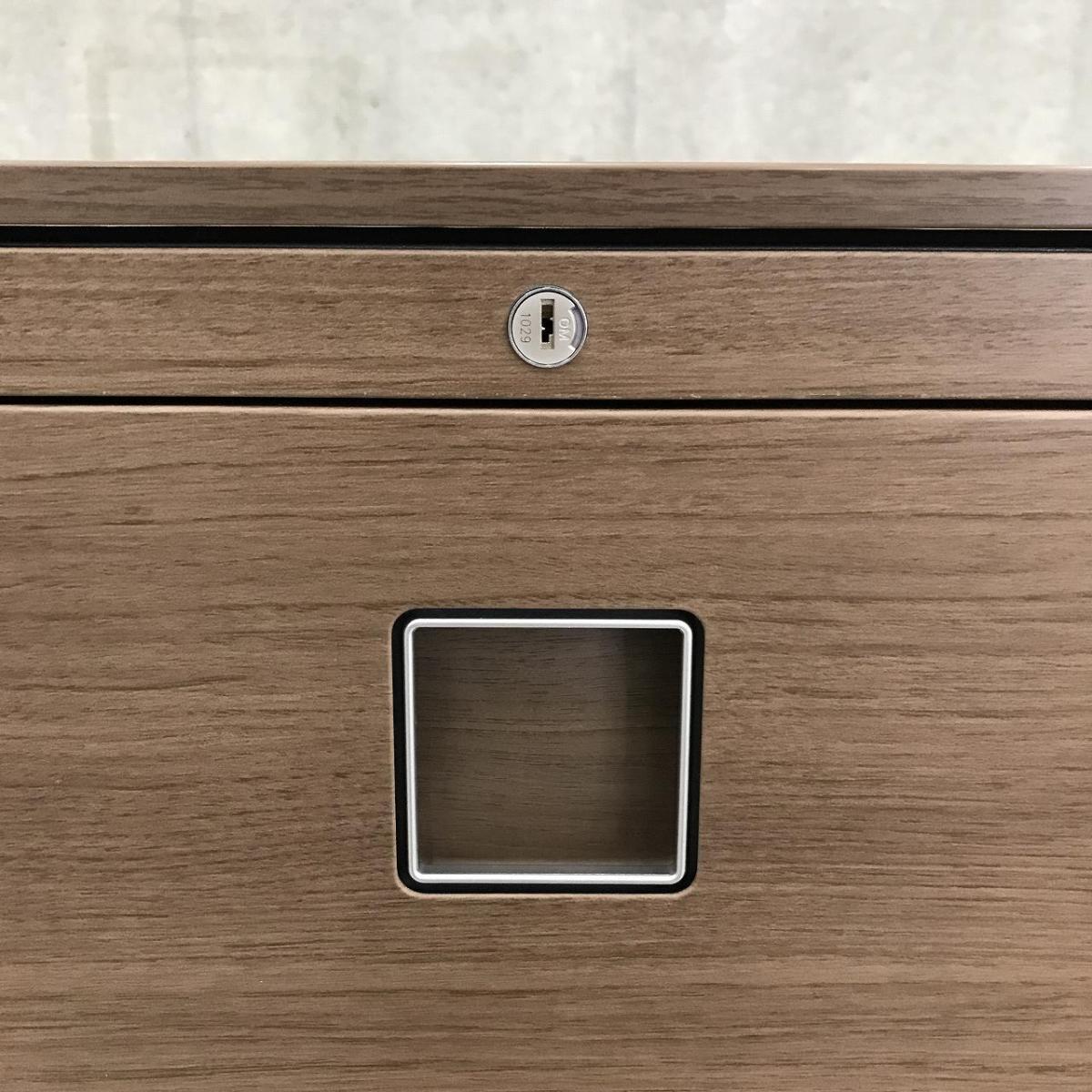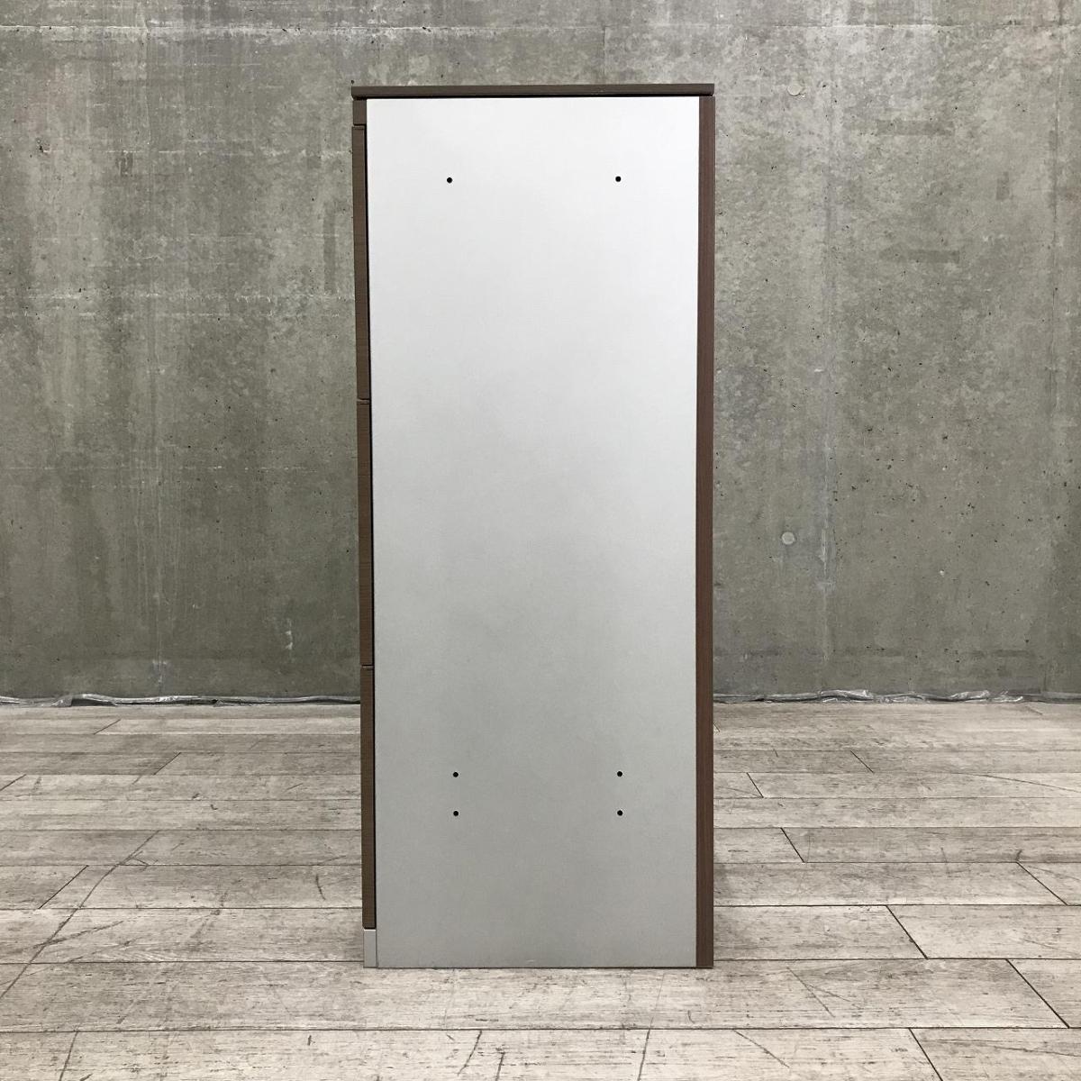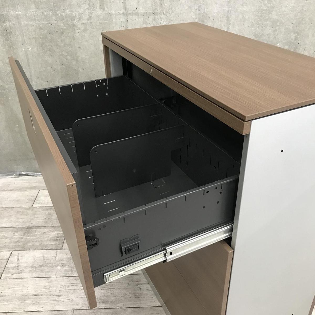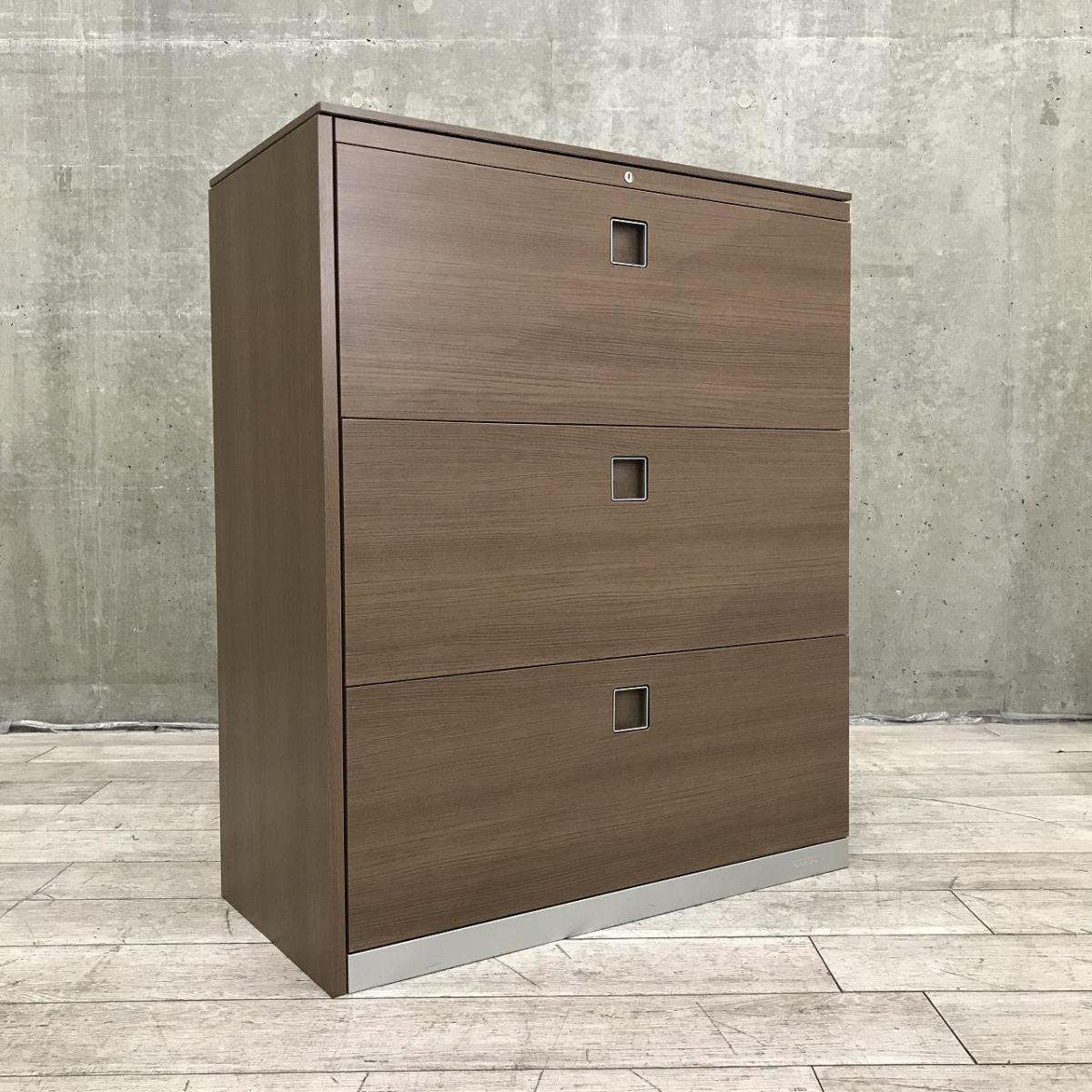 【西】【珍しいカラーリング!高品質で使いやすい人気の3段引き出し式書庫!】■オカムラ(okamura)製 レクトラインシリーズ 3段ラテラル書庫 ローキャビネット ■本体:シルバー 天板・正面・背面:木目調ブラウン 左側面:化粧板付 ■シリンダー錠