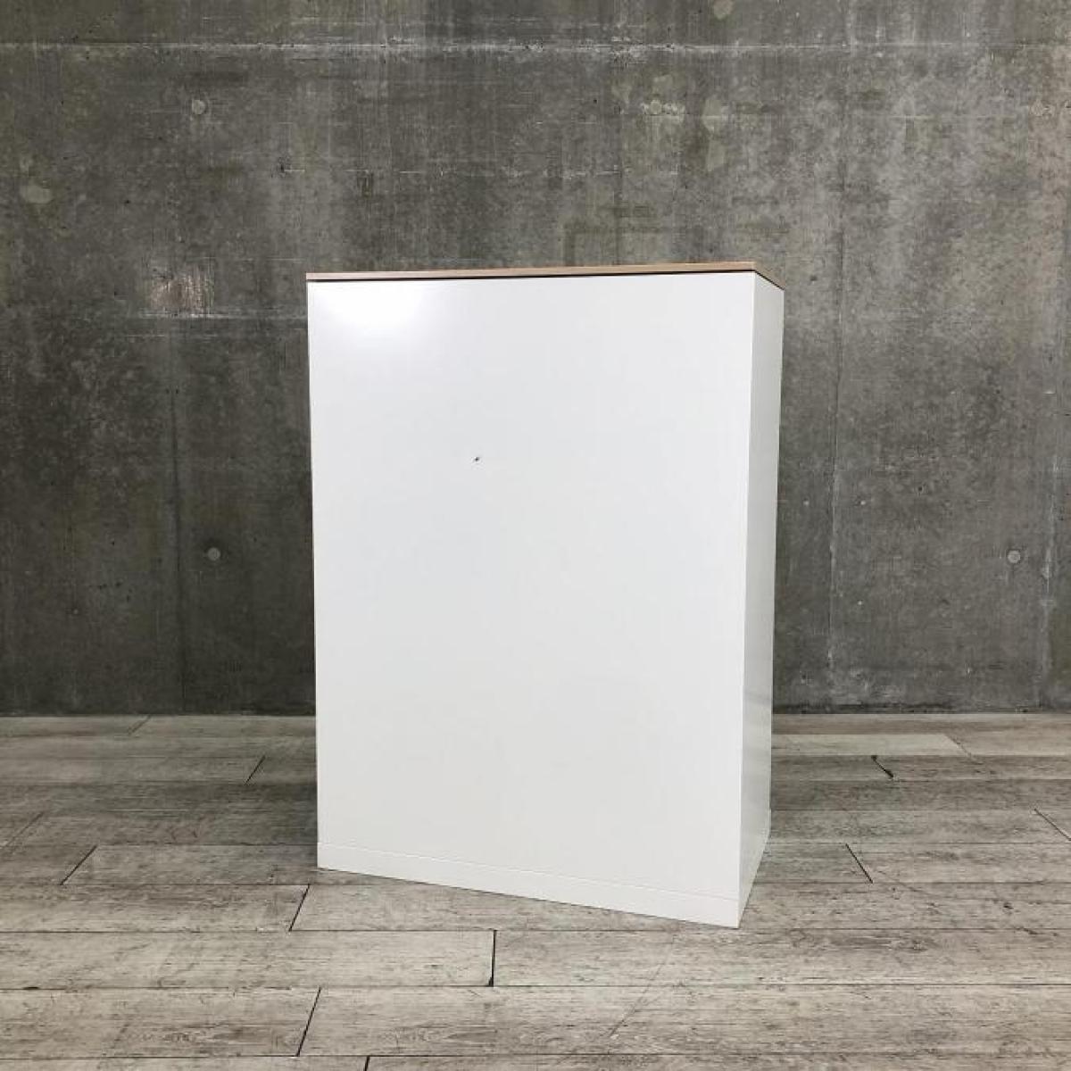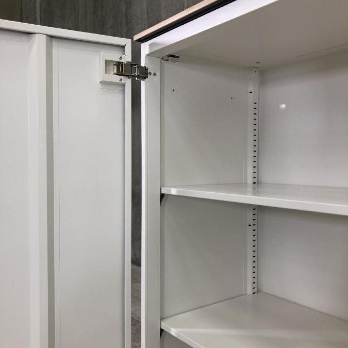 【オフィスの書類をスッキリ整理!取っ手がどの方向からでも開くマルチハンドル!】■オカムラ(okamura)製 レクトラインシリーズ 両開き書庫 ローキャビネット ■ナチュラル木目調天板付き ■本体色:ホワイト ■シリンダー錠サーキュラーバリューCO2削減量の算出について