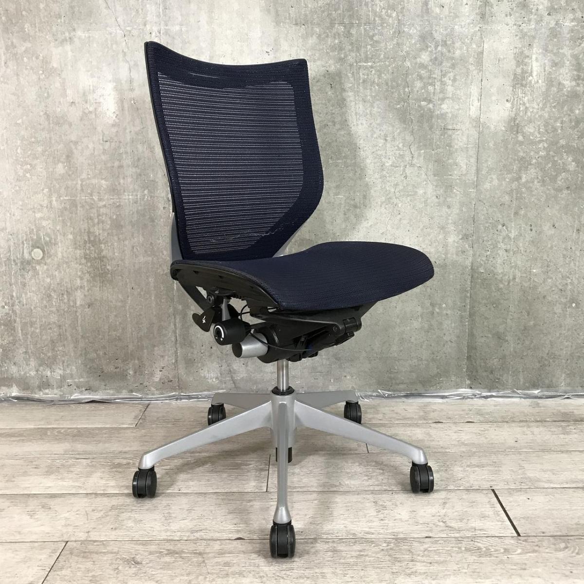 【オフィスの執務室、会議室におすすめ!】■オカムラ(okamura)製 バロン(Baron)チェア ローバック 肘無し ■背面メッシュ ■ハンガー付 ■色:ネイビーブルー×ブラックシェル【国産メッシュチェアの代表格!】